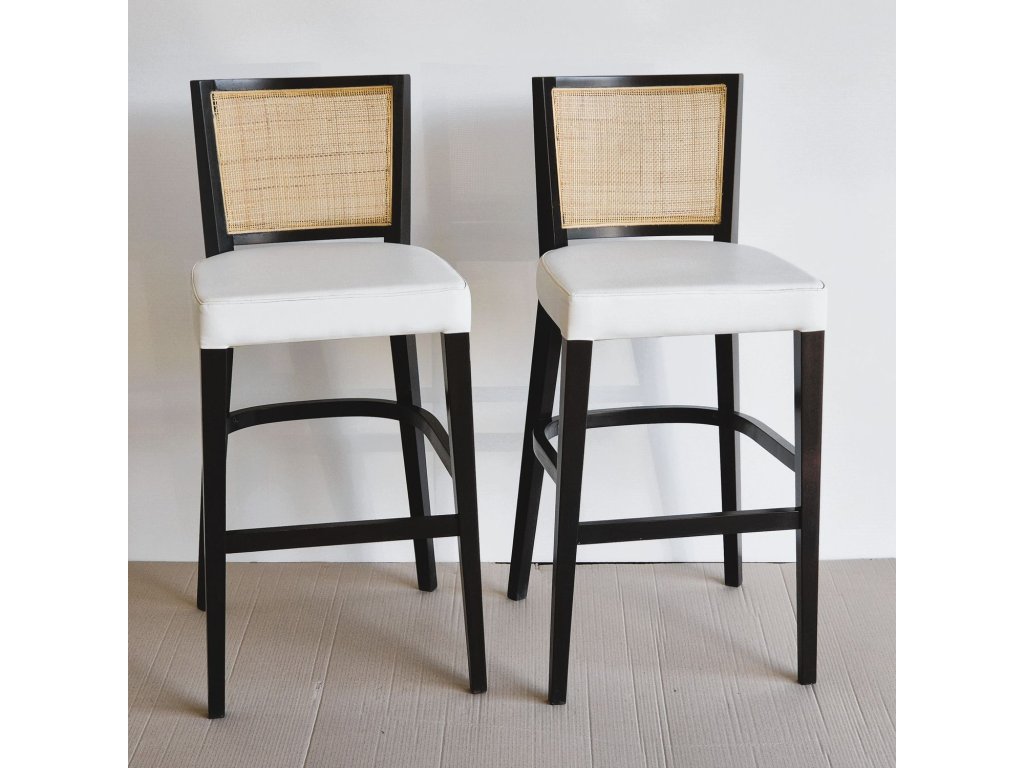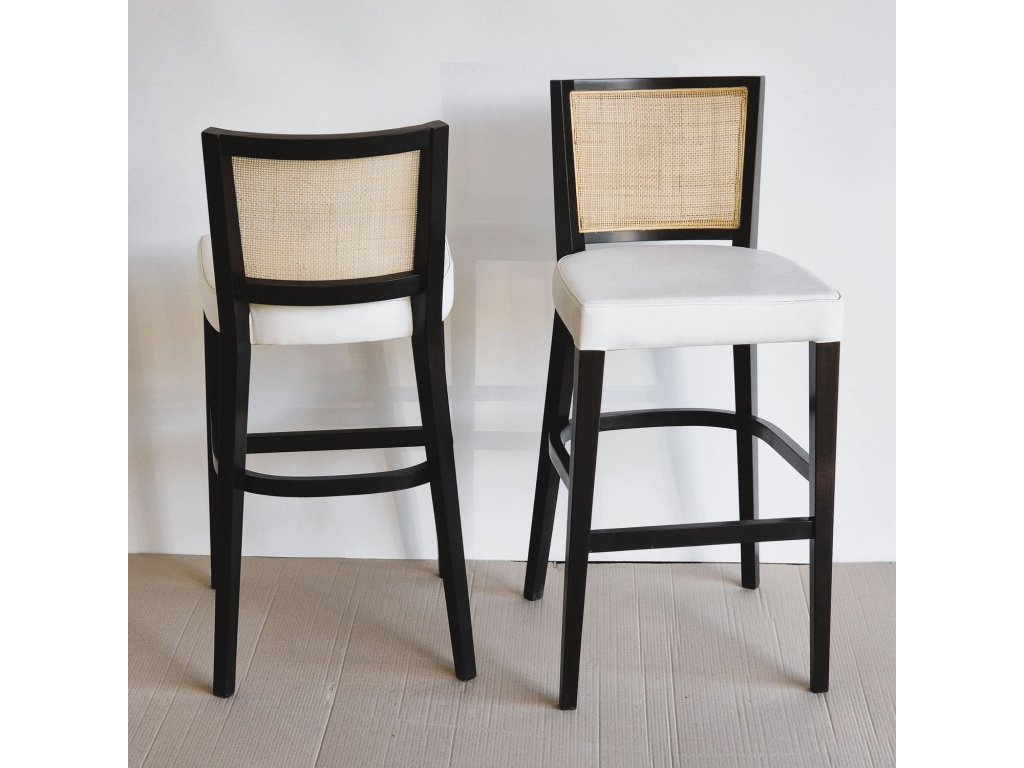 Stylové barové židle s masivní bukovou konstrukcí v černé barvě, pohodlným čalouněným sedákem v bílé kožence a opěrka s výpletem v přírodní barvě. Díky kombinaci materiálů a elegantnímu provedení se hodí do moderních i retro interiérů.