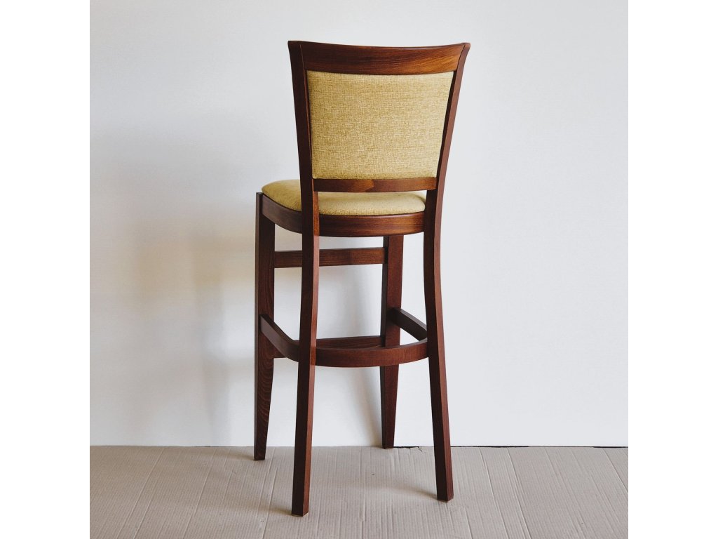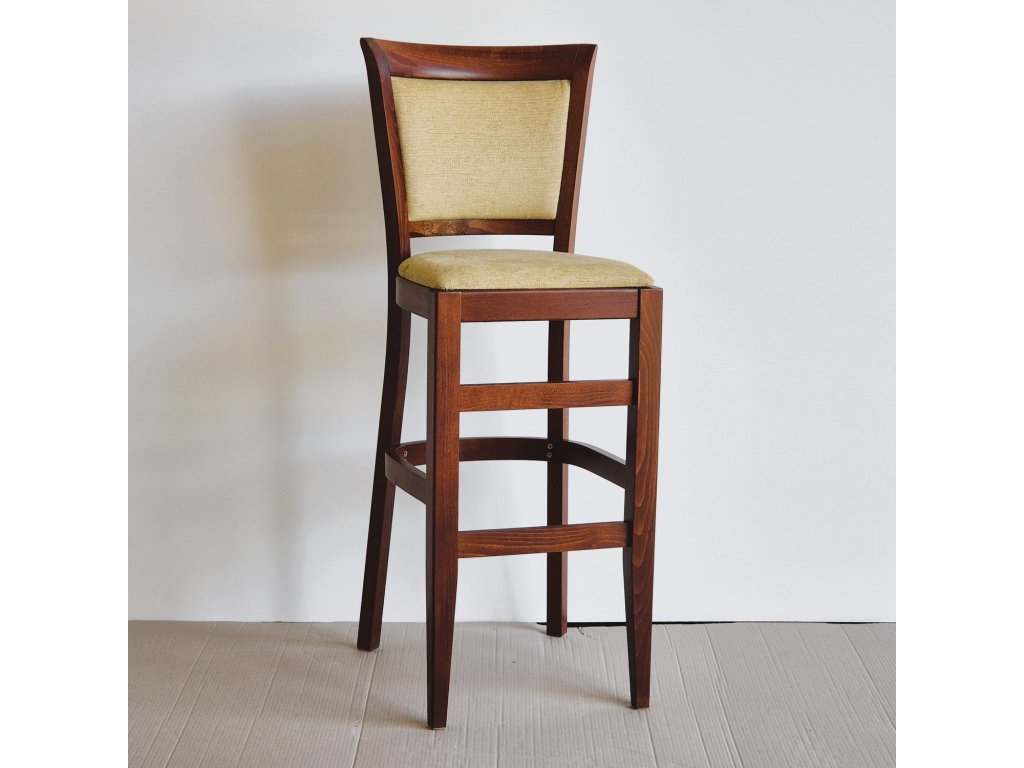 Elegantní čalouněná barová židle s opěrkou zad a tmavě mořenou konstrukcí z masivního dřeva. Sedák i opěrák jsou potažené krémovou tkaninou s jemnou strukturou. Díky komfortní výšce a pevné konstrukci je vhodná do barů, kaváren i domácností. Nadčasový design s čistými liniemi se hodí jak do klasických, tak i modernějších interiérů.