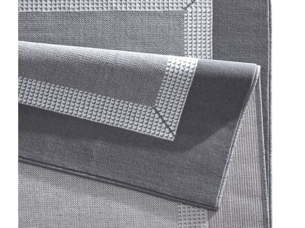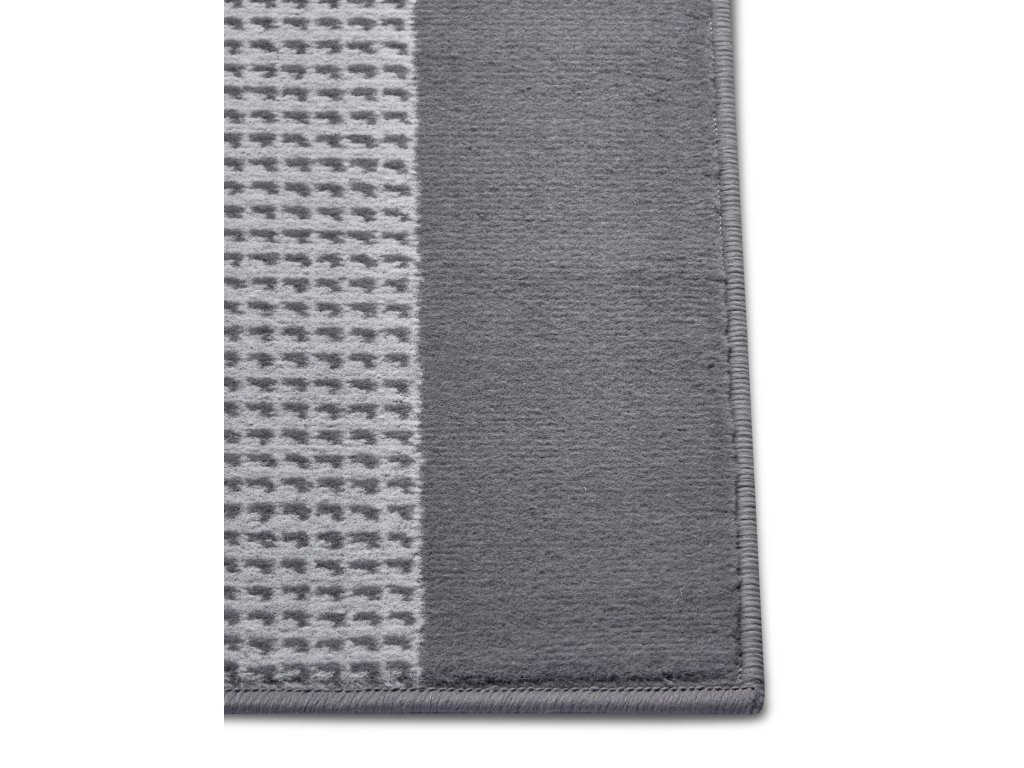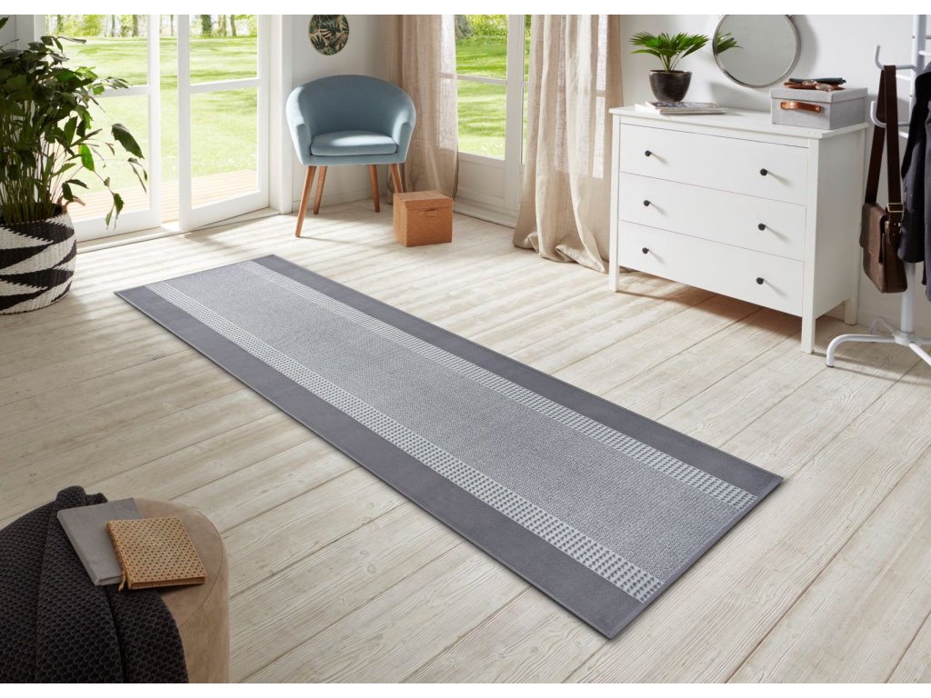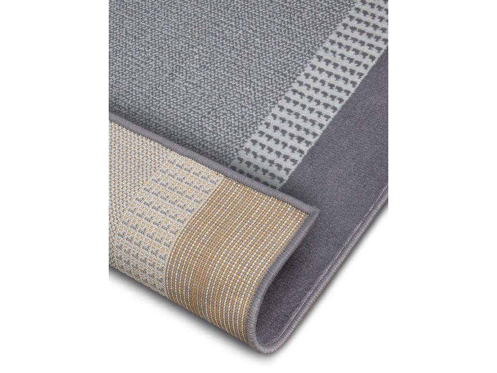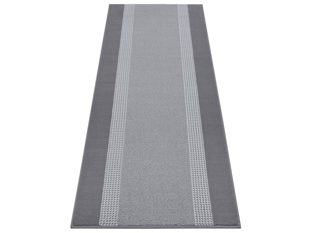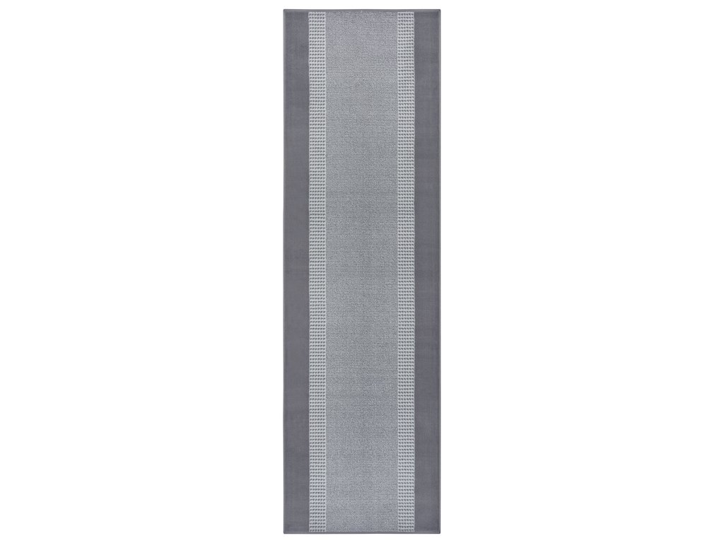 Běhoun se světle šedým středem a tmavě šedými pruhy po obvodu delších stran. Jedná se o kvalitní kousek ze 100% polypropylenu s jutou na rubové straně. Díky středně vysokému střiženému vlasu je velmi komfortní na došlap. Dále je obšitý po celém obvodu a snadno udržitelný.