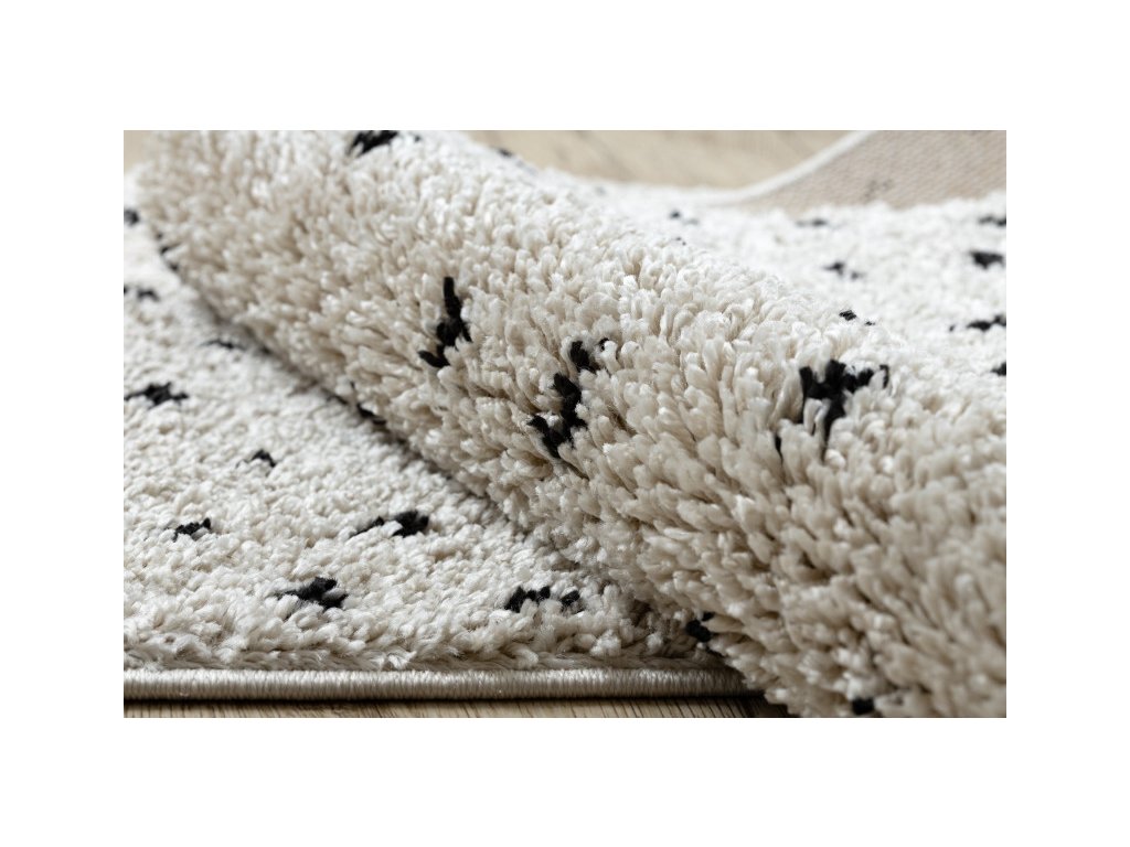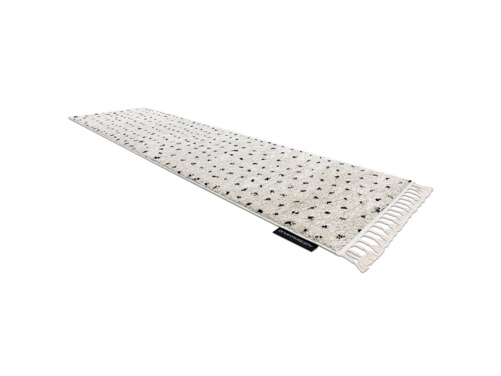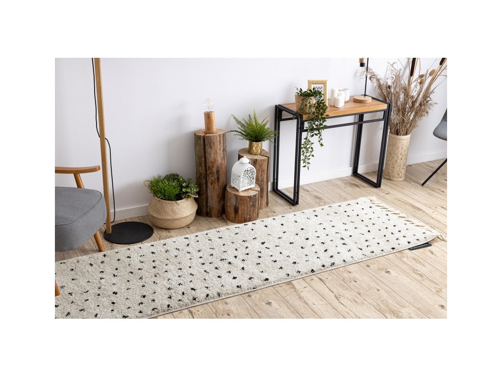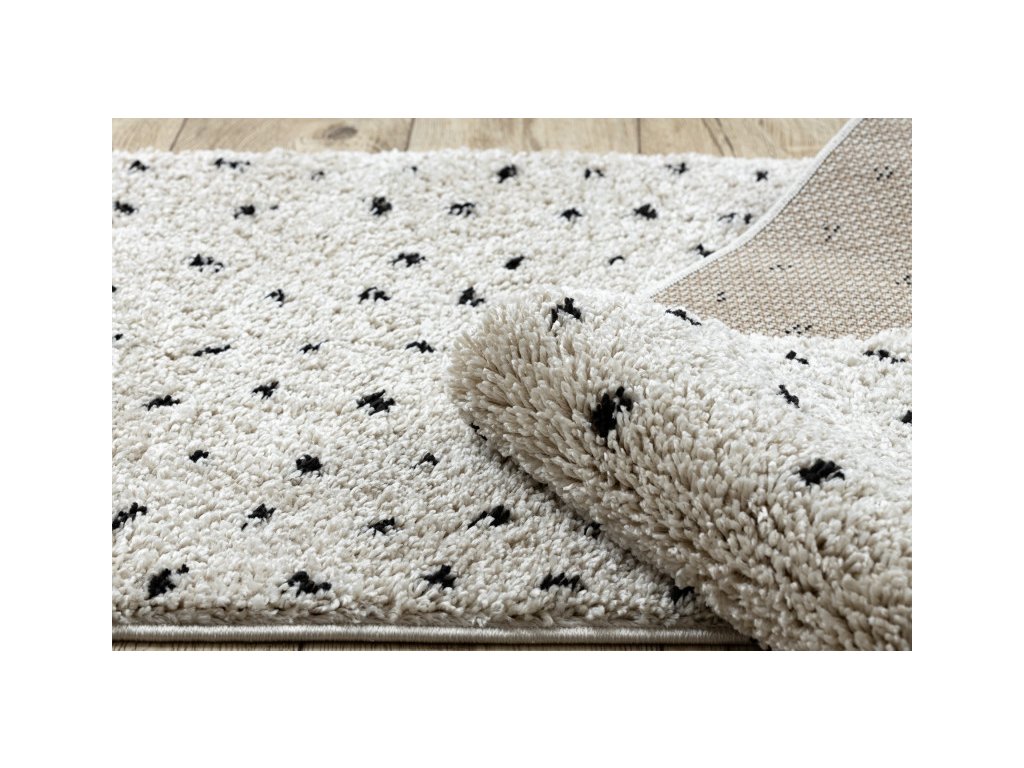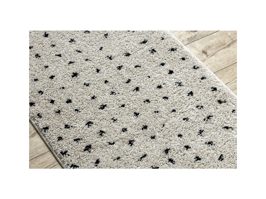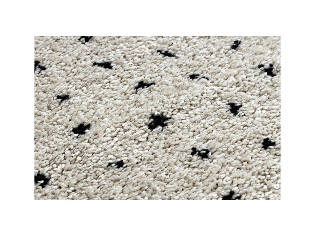 Běhoun Berber v krémové barvě s tečkami se bude vyjímat v jakémkoliv interiéru. Velké uplatnění najde v obývací pokoji ve stylu boho. Decentní barva, shaggy vlas a vysoká hustota vám zaručí příjemný pocit na dotyk. Běhoun je vyrobený z velmi kvalitního polypropylenu, který mu vypůjčuje velkou stálost. Kratší strany běhounu jsou zakončeny spletenými střapci.