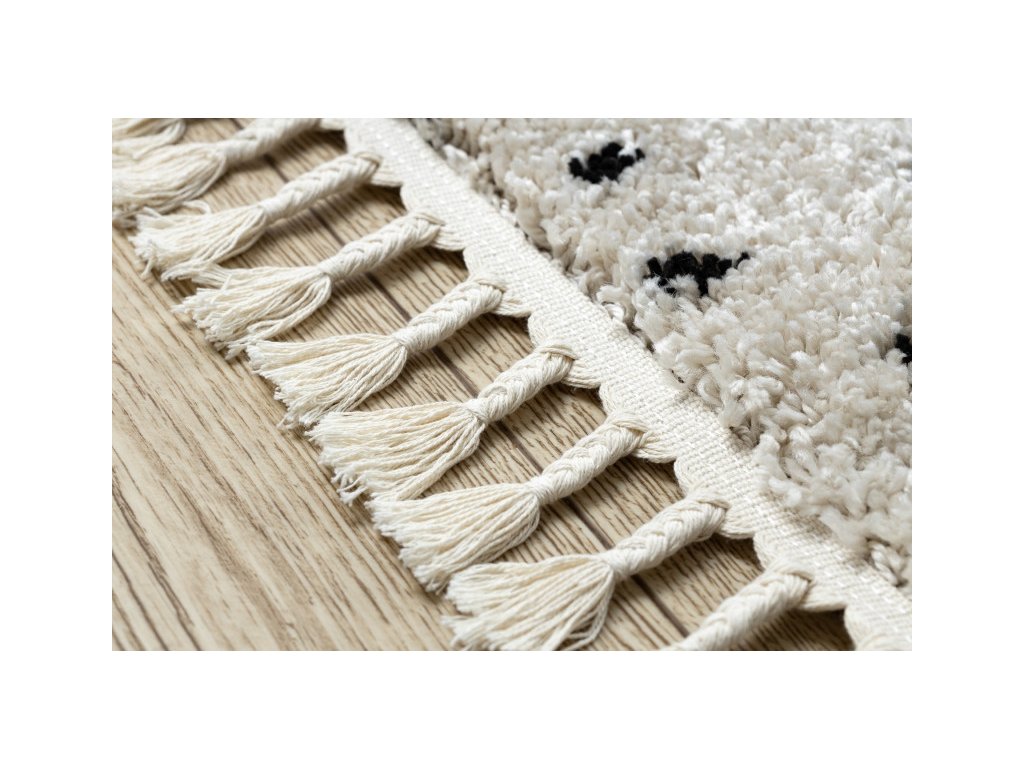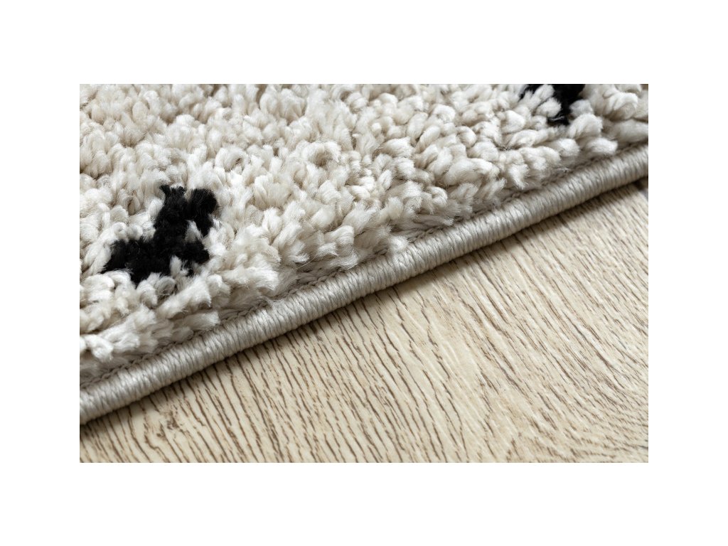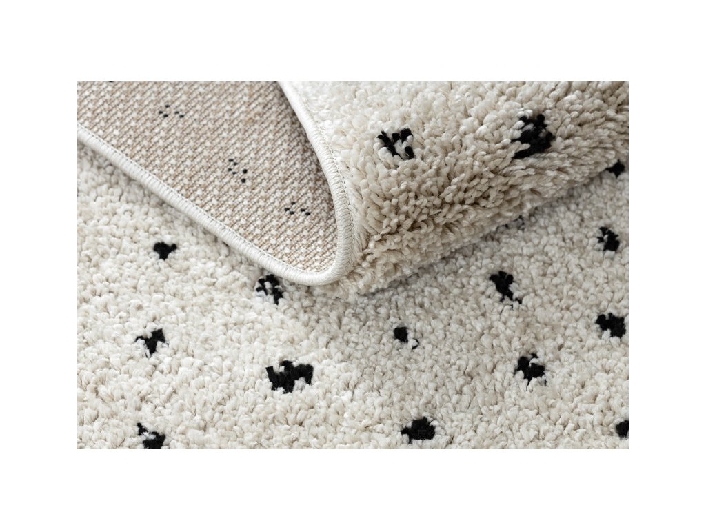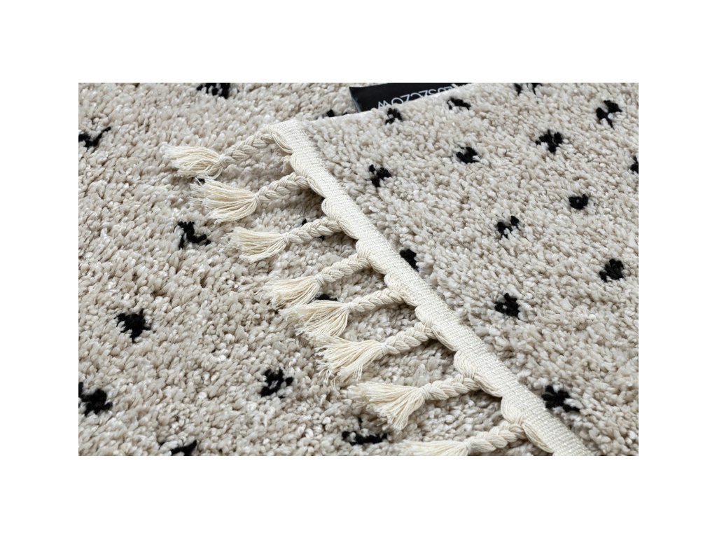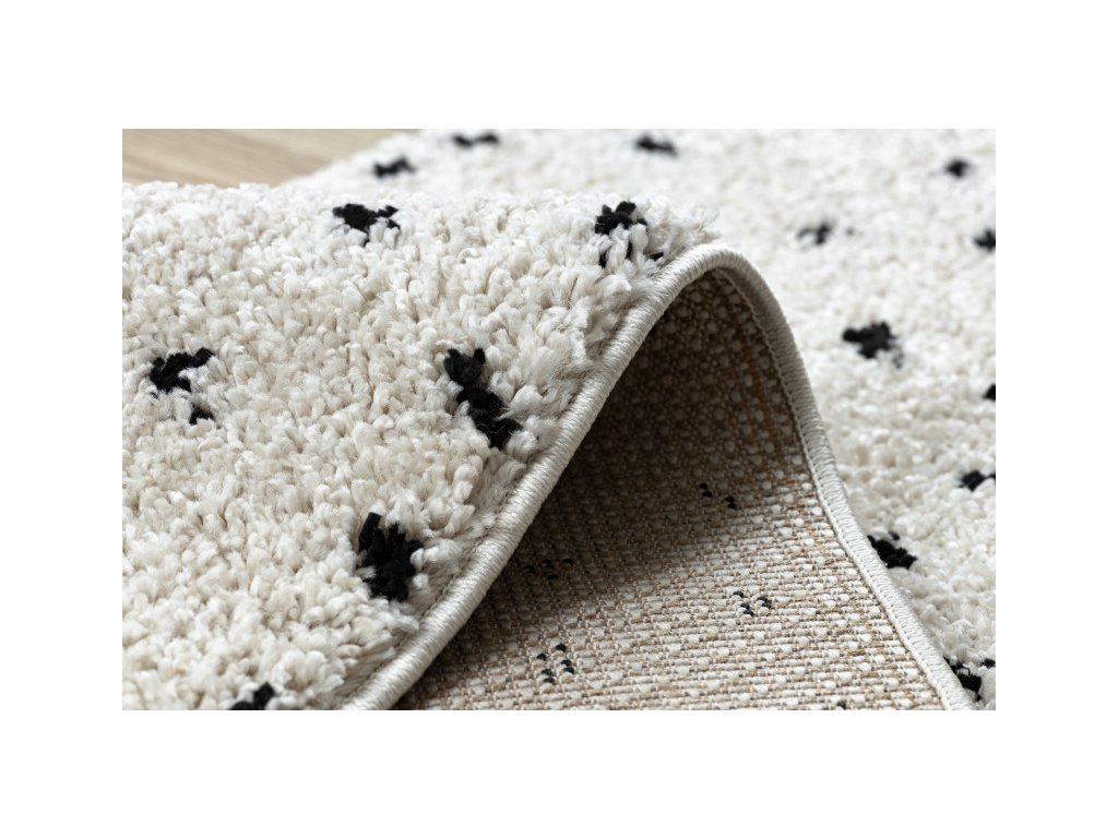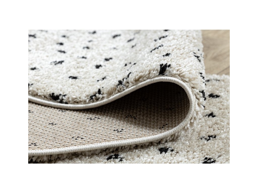 Běhoun Berber v krémové barvě s tečkami se bude vyjímat v jakémkoliv interiéru. Velké uplatnění najde v obývací pokoji ve stylu boho. Decentní barva, shaggy vlas a vysoká hustota vám zaručí příjemný pocit na dotyk. Běhoun je vyrobený z velmi kvalitního polypropylenu, který mu vypůjčuje velkou stálost. Kratší strany běhounu jsou zakončeny spletenými střapci.
