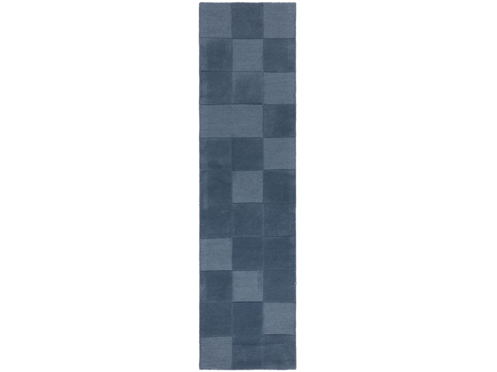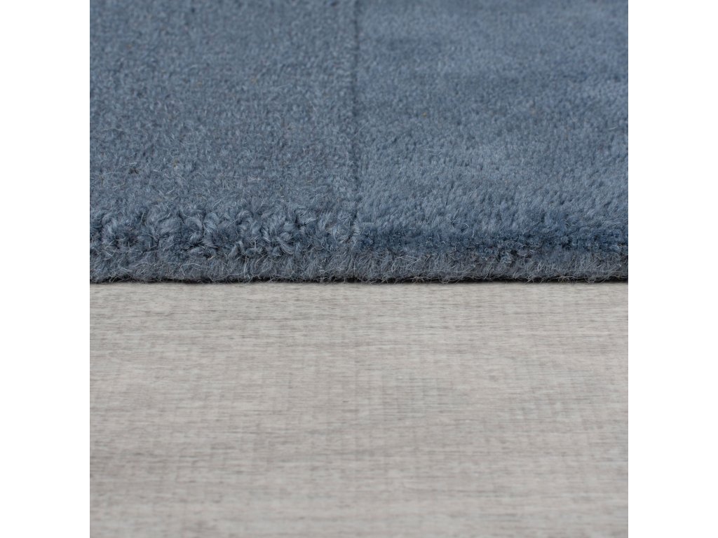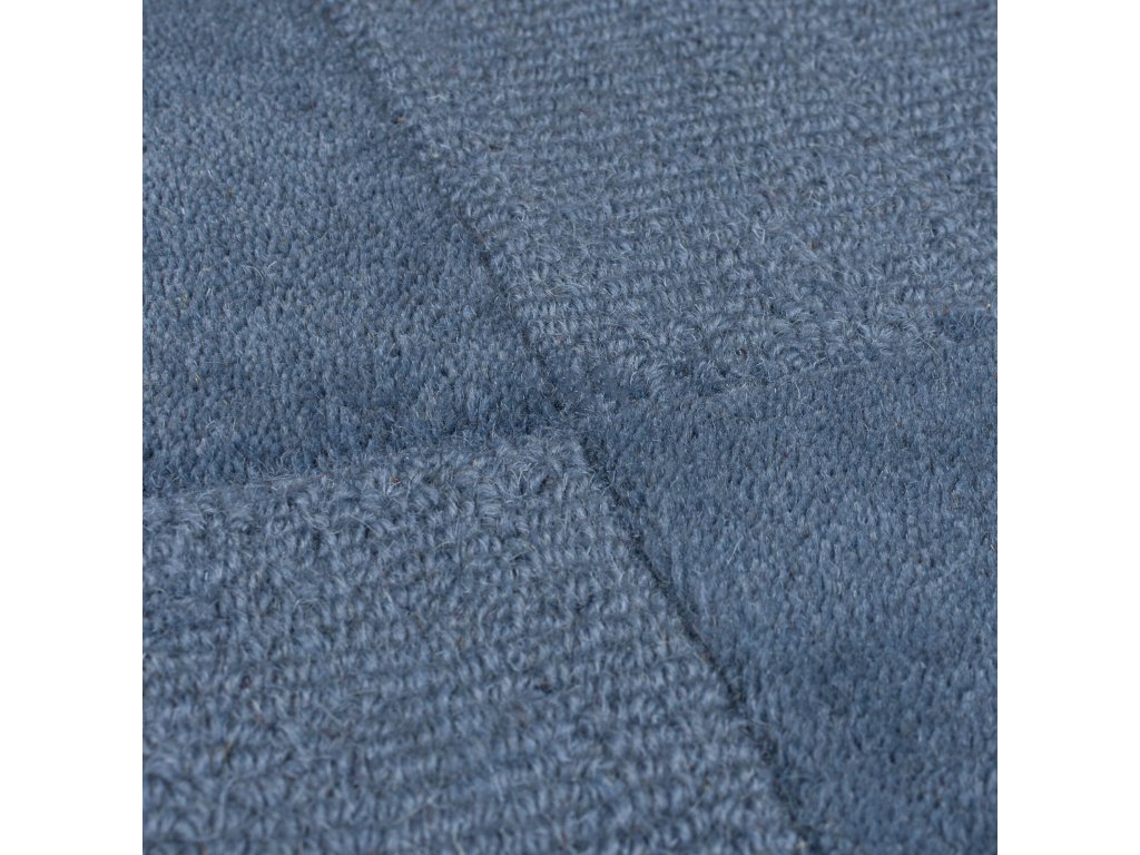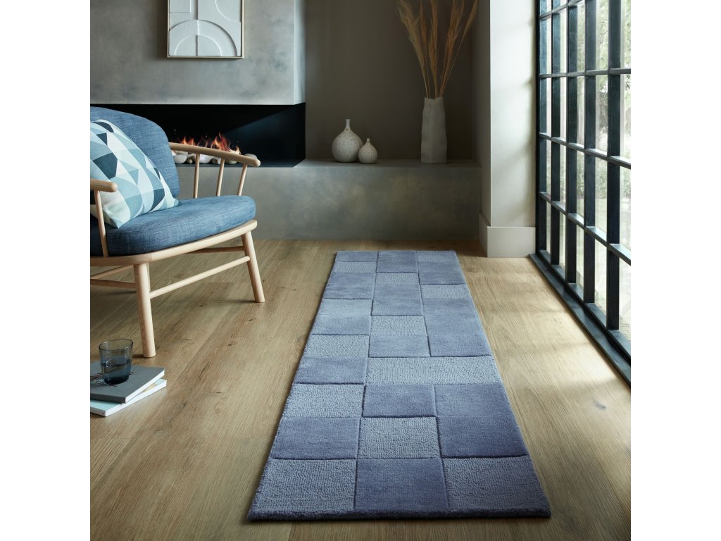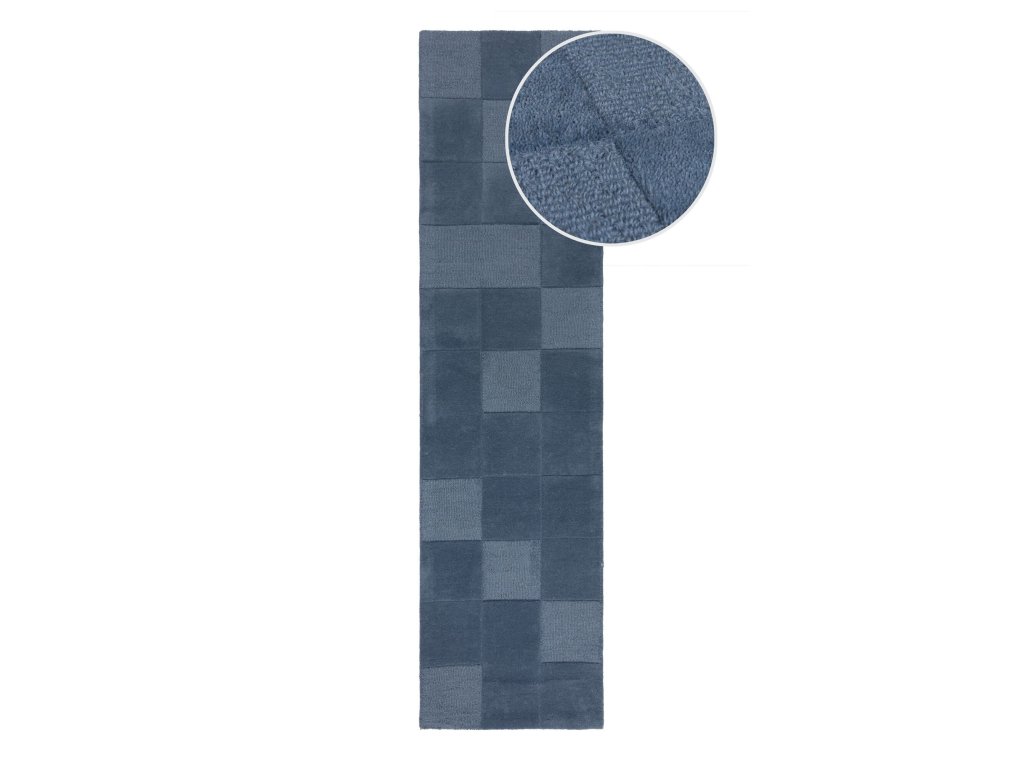 Modrý běhoun s čtvercovým vzorem a různě vysokým vlasem dodává interiéru moderní a elegantní vzhled. Ručně střižené detaily vytvářejí zajímavý 3D efekt, který zaujme na první pohled. Díky vlně skvěle izoluje chlad a tlumí hluk.