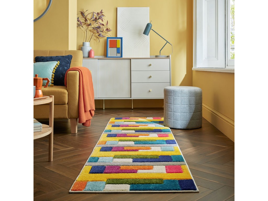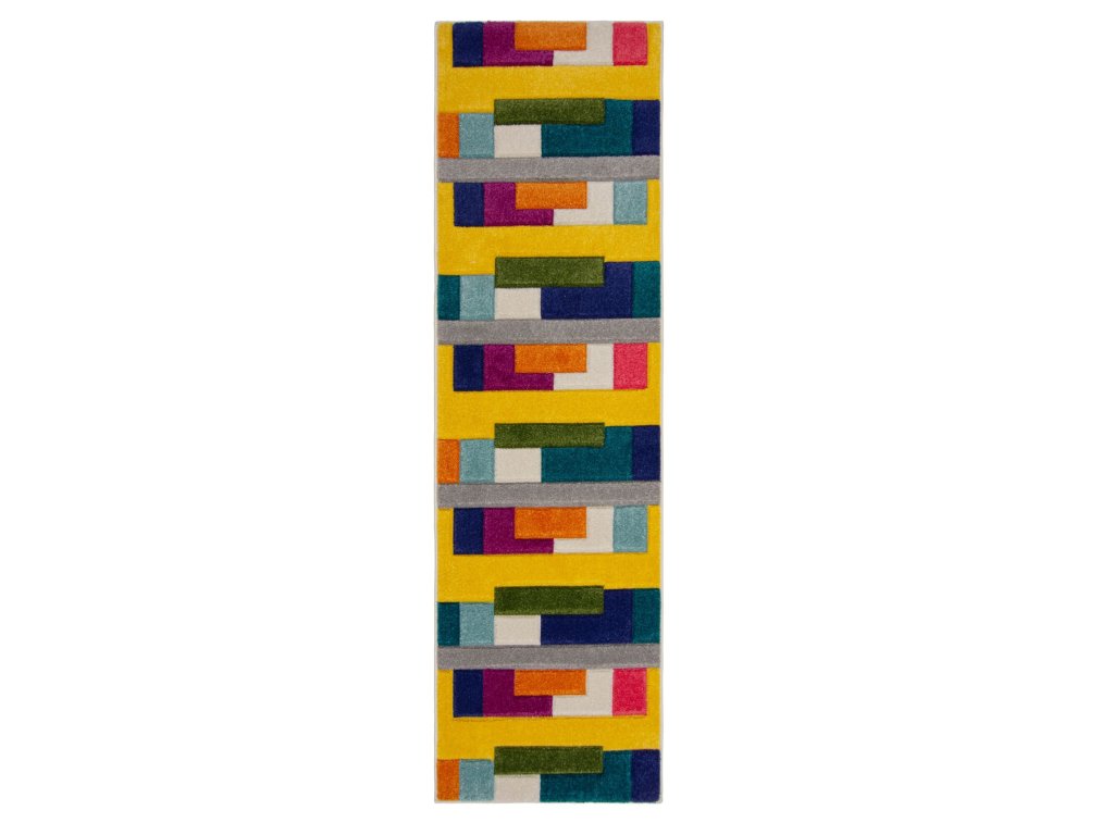Moderní běhoun zaujme svým unikátním designem, kde se prolínají různobarevné obdélníky a další geometrické tvary. Barevná paleta je živá, ale zároveň vyvážená, takže skvěle doplní každý interiér. Koberec je vyroben ze 100% polypropylenu, což zajišťuje dlouhou životnost a snadnou údržbu. Díky vyššímu vlasu je příjemný na dotek, ideální pro obývací pokoje nebo ložnice.