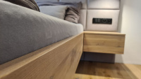 Postel jsme vyrobili z masivního dubového dřeva v odstínu dub bělený s kartáčovaným povrchem a sladili ji tak s podlahou, která je rovněž z běleného dubu. Noční stolky disponují bezúchytkovým otevíráním, díky kterým mají jednoduchý, celistvý vzhled, a ze spodní strany led osvětlením s pohybovým čidlem – mohou se rozsvítit pokaždé, když v noci vstanete z postele.