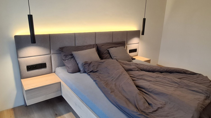 Výrazným prvkem celé ložnice je celočalouněné čelo postele potažené látkou NORDIC imitující vlnu. Čalouněný vzhled a ambientní osvětlení umístěné na horní hraně čela dodávají místnosti na útulnosti. Zabudované zásuvky a vypínače jsou na dosah ruky a umožňují pohodlnou manipulaci s osvětlením i dobití telefonu. Díky minimalistické kovové podnoži v černé barvě postel působí, jako by levitovala v prostoru a dodává místnosti vzdušnost a moderní vzhled.