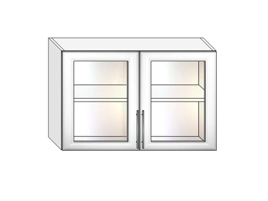 Horní prosklená skříňka H90S z kuchyňské sestavy BRAVO 8 s dvěma dvířky a 2 úchytkami K110 (typ hrazda) s roztečí 160 cm orientovanými svisle. Skříňka je vyrobena z laminované dřevotřísky tl. 18 mm, ABS hrany, záda bílý sololak, profilovaná fóliovaná dvířka ve tvaru rámečku. Sklo ve dvířkách můžete vybrat ze 4 standardních dekorů - grep, bílá voda, stalactit a krizet.