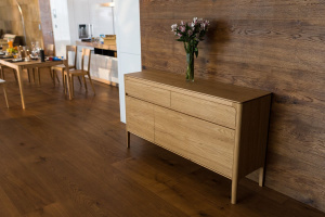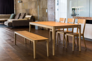Stoly jsou vyrobeny z dubového jádrového dřeva, které se vyznačuje specifickou zlatavou barvou a výraznou, autentickou kresbou, kdy se střídají tmavší a světlejší odstíny jádra a běle. Právě tento přírodní materiál dodává interiéru teplo a zatepluje ho do hřejivých tónů. Povrch je navíc ošetřen transparentním olejem, což zachovává přirozený vzhled dřeva a zároveň zajišťuje snadnou údržbu.