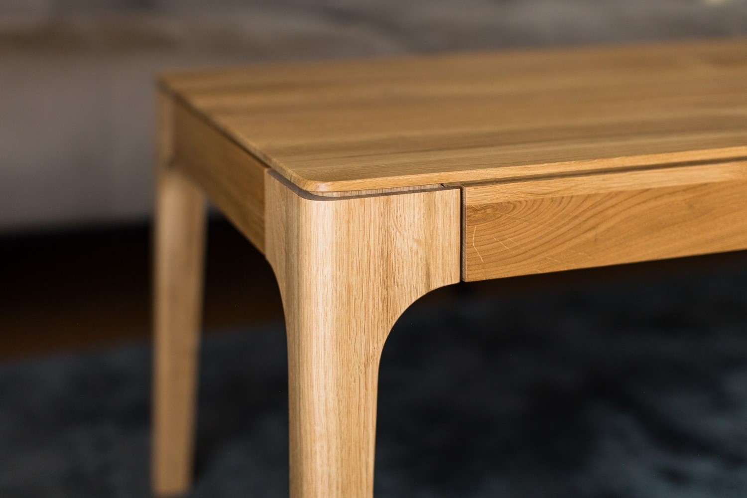 Co dělá tyto stoly tak výjimečnými? Je to důmyslné optické řešení, kde je stolová deska, nohy a rám odděleny tenkou drážkou. Tato subtilní linka není jen designovým prvkem, ale díky hře světla a stínu ještě víc zvýrazňuje tenké, elegantní linie celé konstrukce. Výsledkem je lehkost a vzdušnost, které byste u nábytku z masivu možná nečekali.