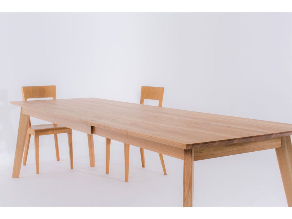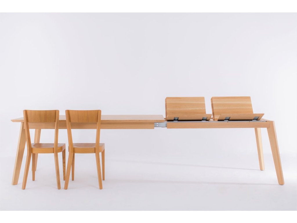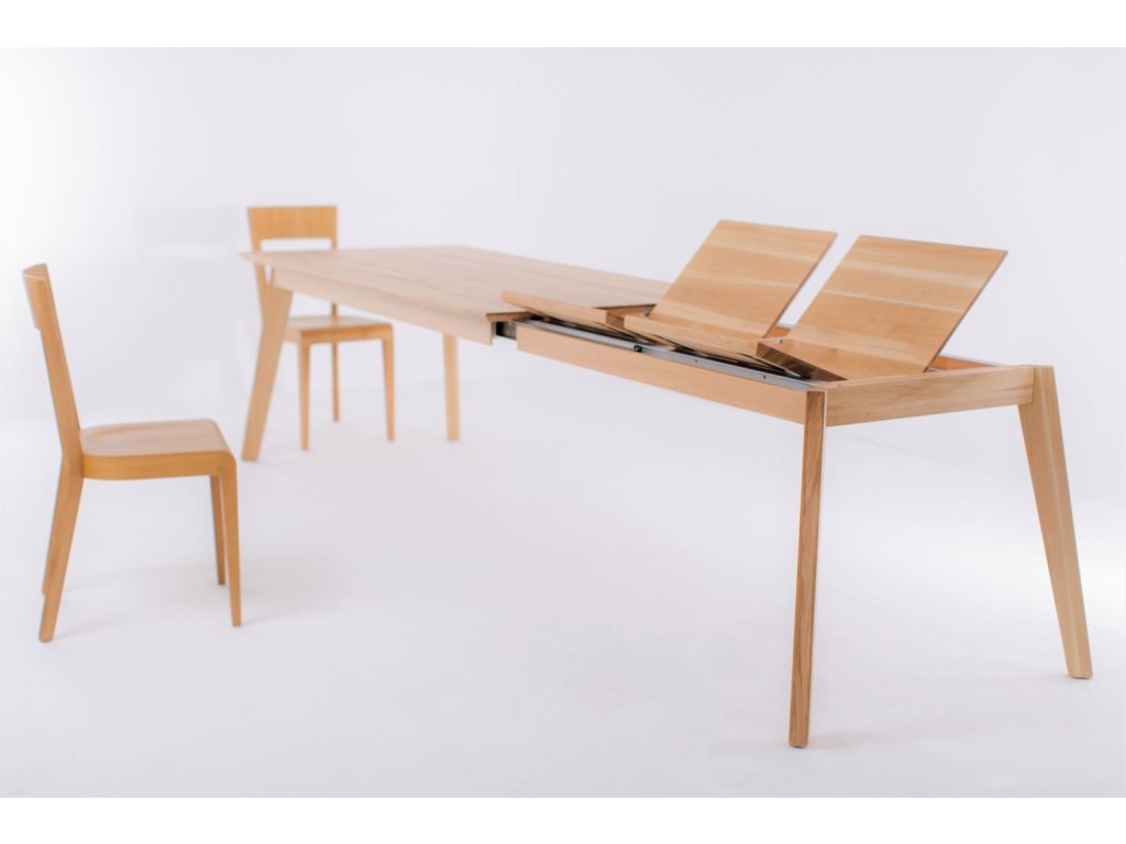 Rozkládání je ukryto pod stolovým plátem. Rozložení provedete odsunutím páru noh od plátu a vložením rozkládacího dílu. Rozklad je možný o dvě velikosti po 50 cm. Celková délka stolu po rozložení je 260 cm. Výhodou je zvětšení rozměru mezi nohami po rozložení - nohy tak zůstávají v rozích stolu, což zajišťuje stejný komfort pro všechny stolující.