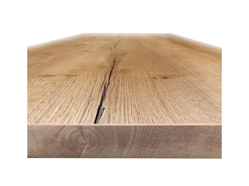 Stůl standardně vyrábíme z laminované dřevotřískové desky v dekoru Dub Halifax přírodní (výrobce EGGER), tl. 38 mm s 3D strukturou. Plát je navíc olepen silnou ABS hranou i s čelním řezem - viz foto. Stolový plát je jednoduchý na údržbu, stálobarevný a hygienicky bezpečný. Ocelovou podnož komaxitujeme černou matnou barvou a montujeme ji 20 cm od okraje stolové desky na závrtné matice.