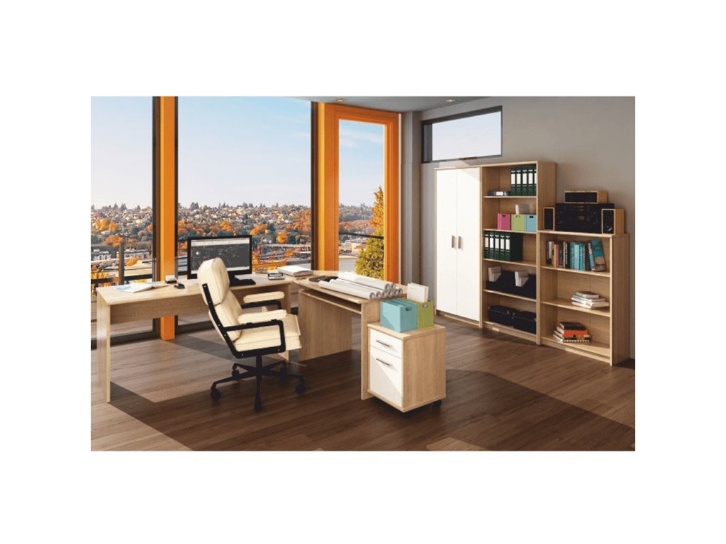 Kancelářská sestava JOHAN v moderním barevném provedení dub sonoma / bílá je ideální volbou pro vybavení kanceláře i domácí pracovny. Praktická kombinace psacích stolů, regálů, skříně a kontejneru poskytuje dostatek pracovního i úložného prostoru. Elegantní vzhled v přírodním dekoru s bílou a kvalitní provedení z laminované DTD s ABS hranami zajišťují dlouhou životnost a snadnou údržbu.