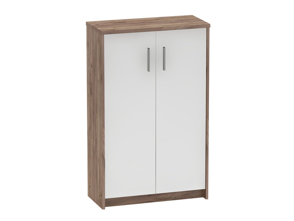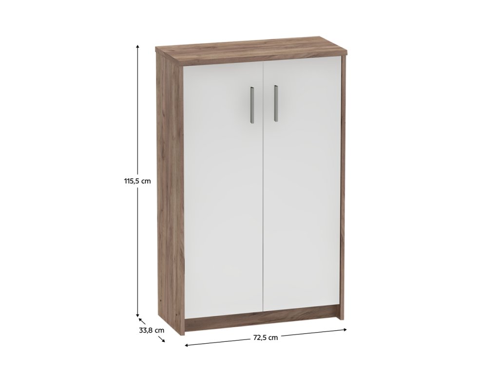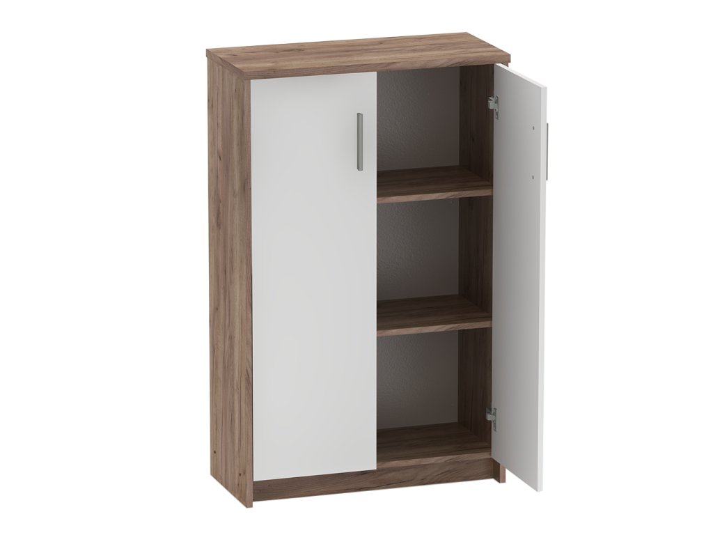 Kancelářská skříňka JOHAN v atraktivní kombinaci dekoru kraft dunkel a bílé barvy dodá vaší kanceláři moderní vzhled. Za dvěma dvířky se nacházejí dvě police, které poskytují praktický úložný prostor pro dokumenty, šanony nebo kancelářské pomůcky. Skříňka je doplněna spodním soklem, který zajišťuje stabilitu a elegantní vzhled.