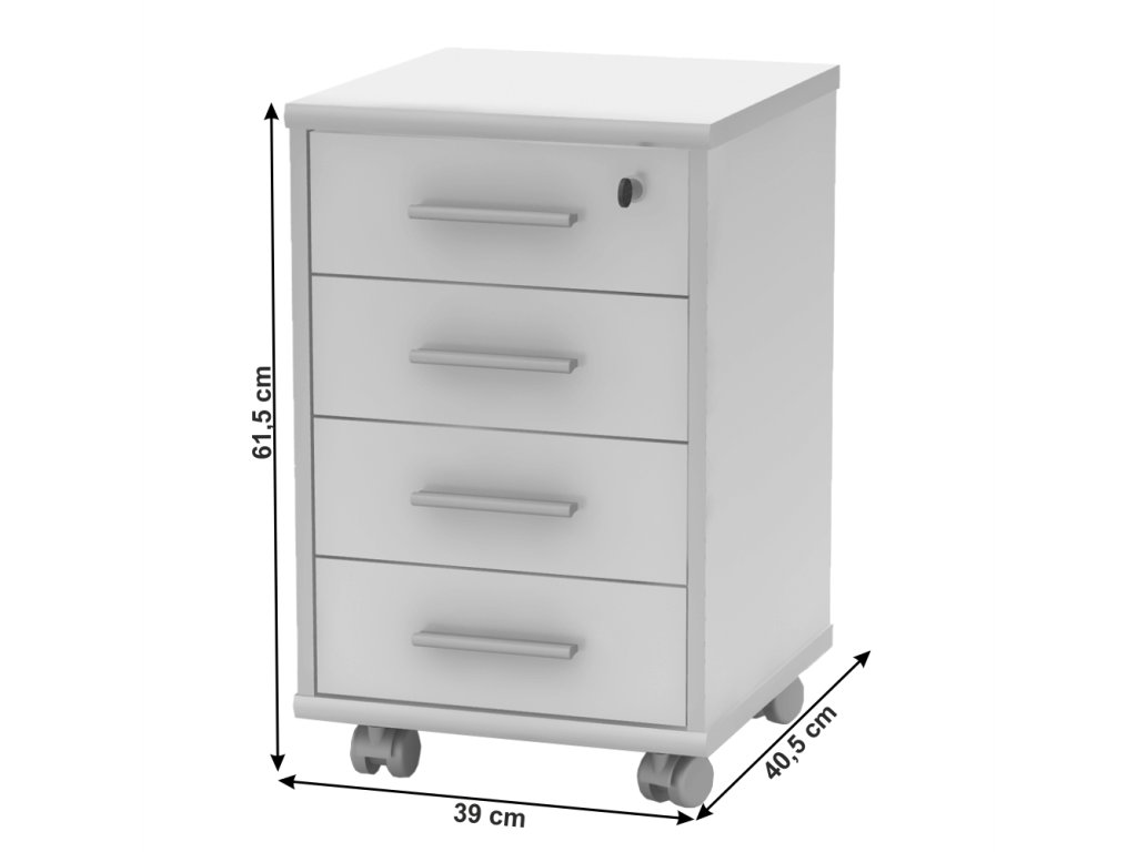 Kontejner se zámkem JOHAN v bílé barvě je praktickým doplňkem pro vaši kancelář. Nabízí čtyři prostorné zásuvky pro přehledné uložení dokumentů, kancelářských potřeb i osobních věcí. Horní zásuvka je vybavena zámkem, takže důležité materiály budete mít vždy v bezpečí. Ostatní zásuvky zůstávají volně přístupné.