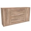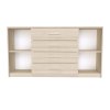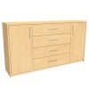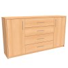 Krajní oddíly skříňky s policemi, v prostřední části 4 zásuvky. Komoda je vyrobena z laminované dřevotřísky s efektními ABS hranami. U komody je možnost výběru hloubky 36 nebo 43 cm.