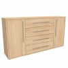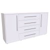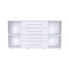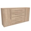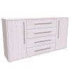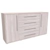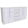 Krajní oddíly skříňky s policemi, v prostřední části 4 zásuvky. Komoda je vyrobena z laminované dřevotřísky s efektními ABS hranami.
