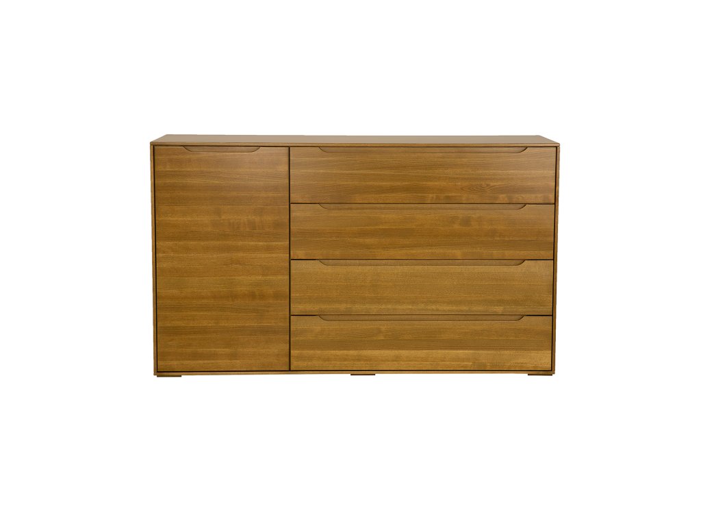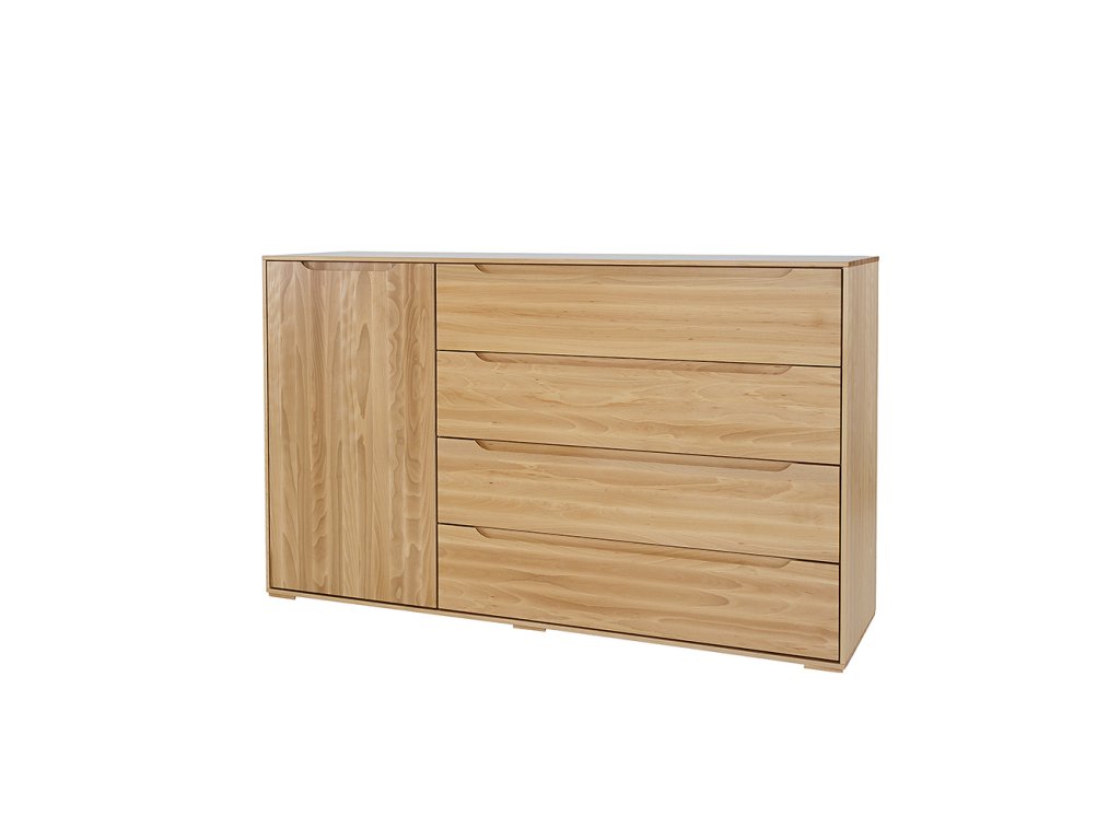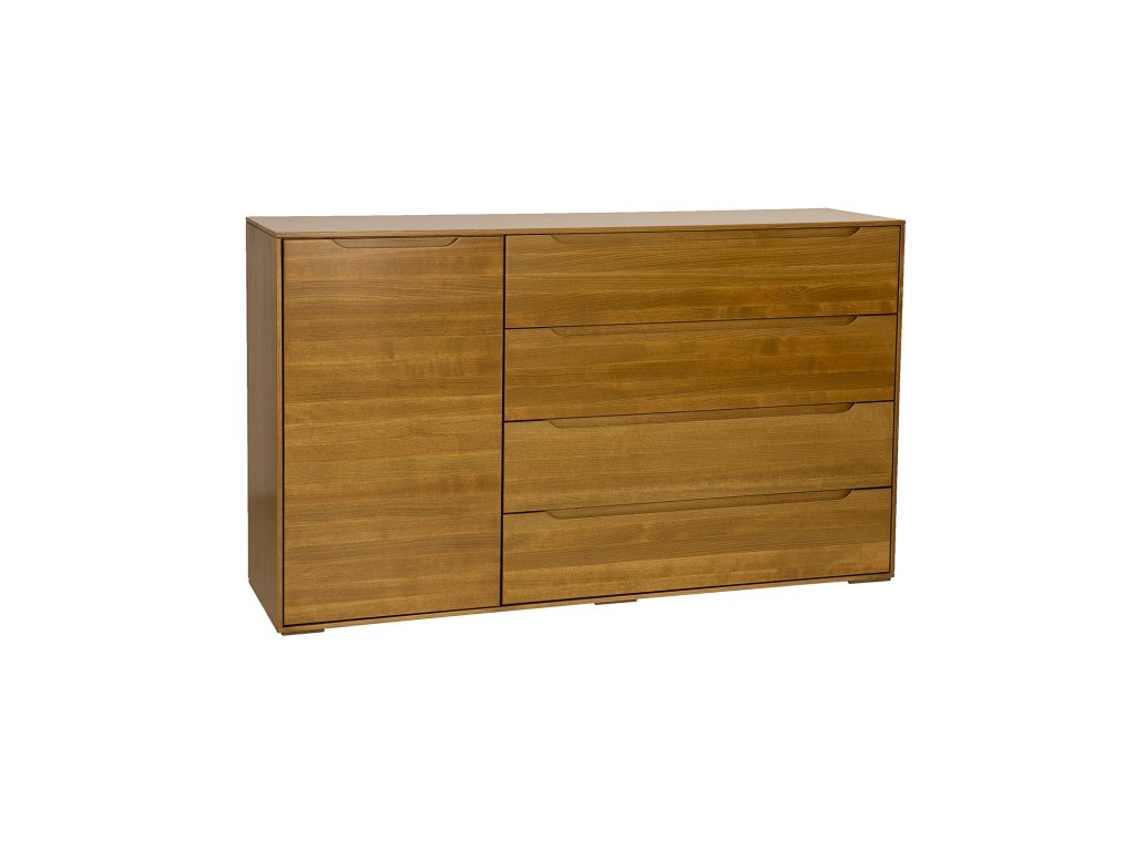 Jednoduchá a elegantní komoda MODERN 4+1 zaujme svým čistým tvarem a minimalistickým zpracováním. Vyrobena je z masivního bukového dřeva, které zaručuje dlouhou životnost, pevnost a jedinečnou kresbu dřeva. Díky kombinaci čtyř prostorných zásuvek a jedné uzavíratelné skříňky nabízí praktický úložný prostor pro každodenní potřeby i drobné dekorace. Frézované úchyty přímo do čel zásuvek dodávají komodě nadčasový a elegantní vzhled.