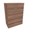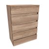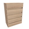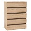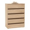 Komoda s 5 zásuvkami originálního a elegantního designu. Komoda je vyrobená z laminovaných desek o tloušťce 18 mm. Bezúchytkové provedení spolu s originálními dekory podtrhují jedinečnost nábytku. Dodáváno v demontu. Na výběr máte ze 14 standardních barevných dekorů lamina s možností volit i kombinace - na poptávku a bez příplatku. Na foto kombinace Dub natur + Akácie skořice mezi zásuvkami.