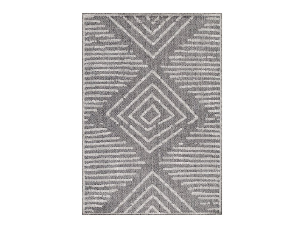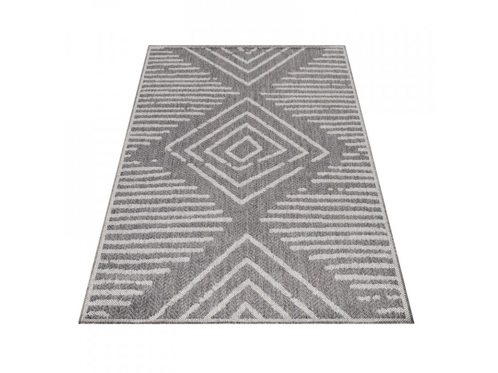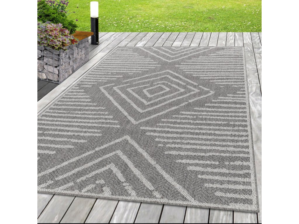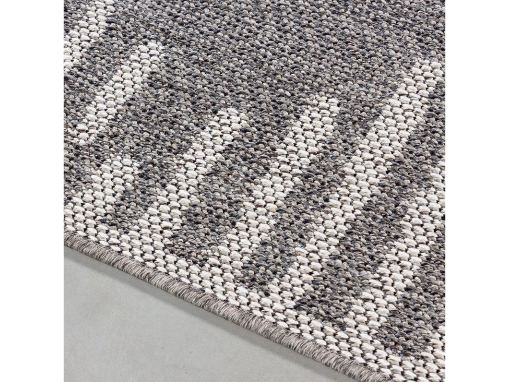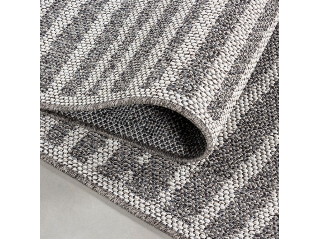 Šedý koberec s kosočtverci uprostřed a pruhy po delších stranách. Tento zajímavý geometrický vzor se bude skvěle vyjímat v chodbě, kuchyni, jídelně i na terase. Koberec je totiž odolný vůči povětrnostním vlivům a snadno udržitelný, a proto ho můžete položit i do exteriéru.