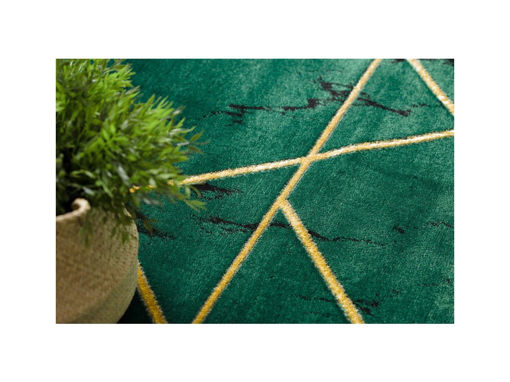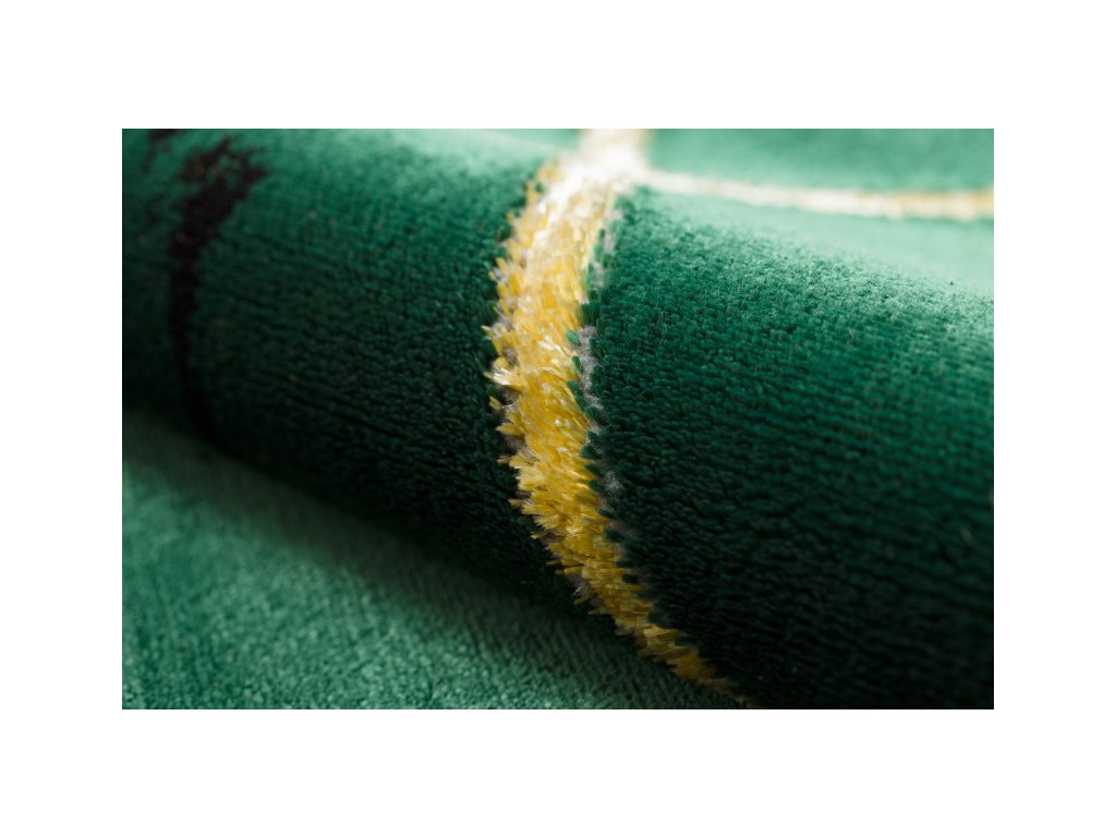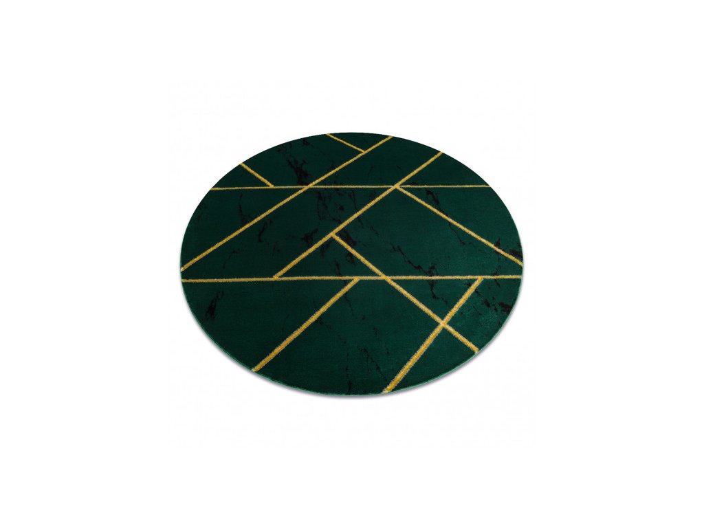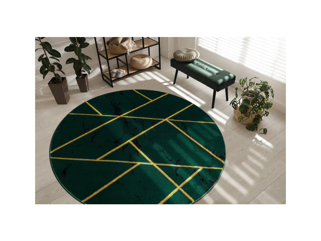 Kruhový koberec Emerald 1012 v barevné kombinaci zelené se zlatým geometrickým vzorem. Tmavě zelené tělo s náznakem mramoru se zlatým vzorem přináší do interiéru eleganci v luxusním provedením, který vytvoří výrazný středobod v místnosti. Velkou předností tohoto koberce není jen vzhled, ale též je i velmi kvalitní. Spojením polypropylenu a polyesteru, vytváří velmi kvalitní, pevnou a na dotyk příjemnou strukturu, která je odolná a stálá. Ve vláknech polyester též vytváří odlesky a tím prohlubuje estetický ráz koberce. Koberec lze položit v prostorech s podlahovým vytápěním.