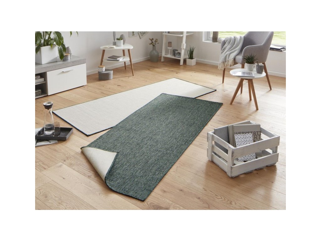 Stylový kusový koberec z kolekce německé značky Hanse Home. Koberec je oboustranný, z jedné strany je zelený a z druhé strany krémový. Koberec se bude skvěle hodit do každého interiéru. Navíc jej můžete použít jako venkovní koberec k dozdobení například venkovní terasy.