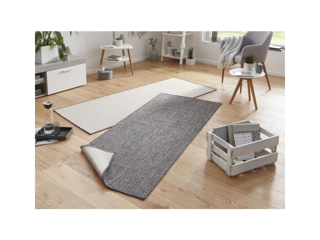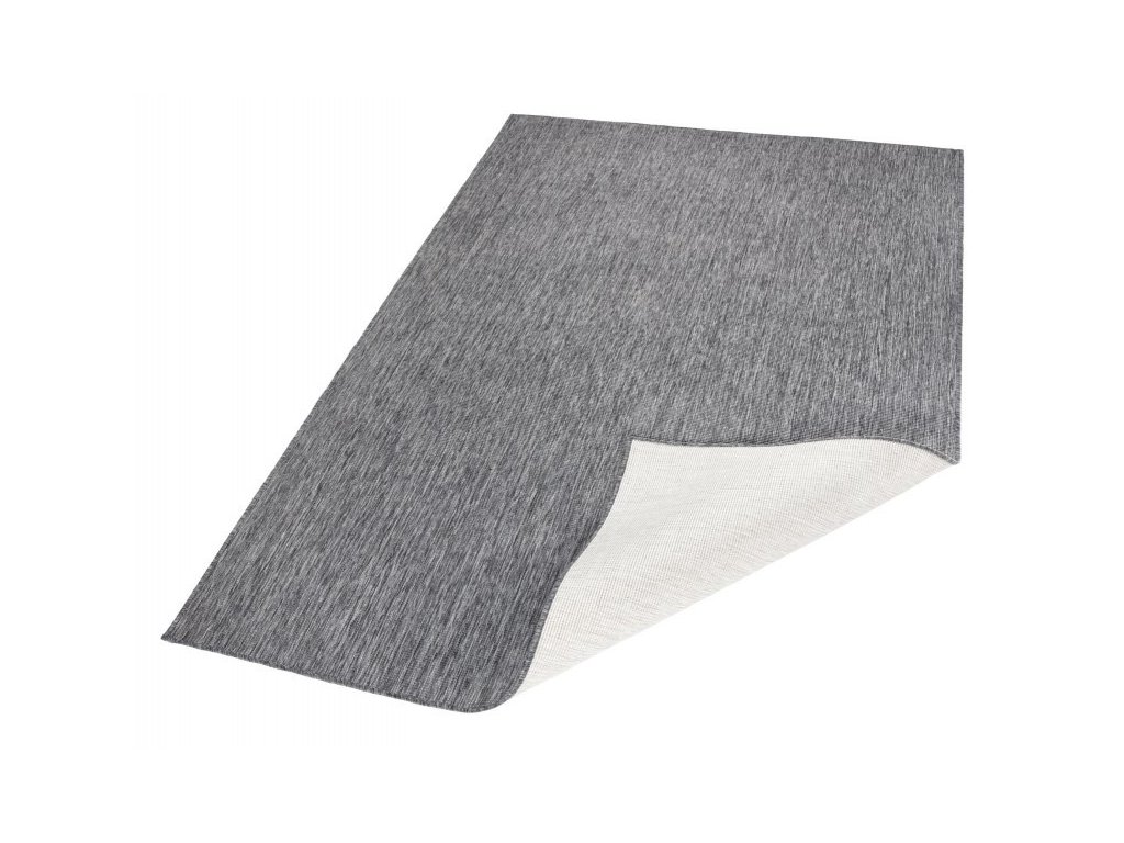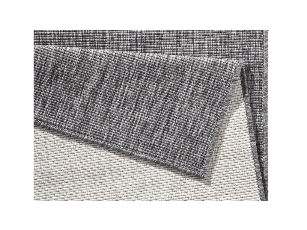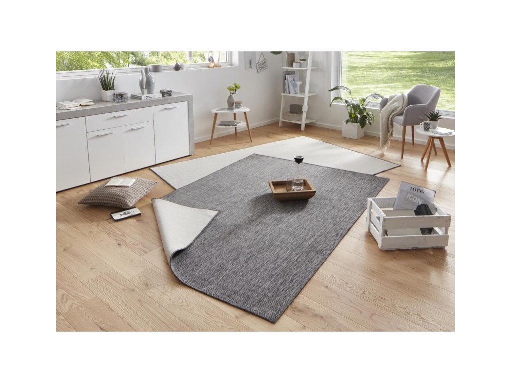 Moderní kusový koberec z kolekce německé značky Hanse Home. Koberec je oboustranný. Z jedné strany je šedý, z druhé strany je krémově světlý. Koberec můžete kdykoliv otočit a změnit tak design interiéru. Koberec Twin-Wendeteppiche 103097 je také skvělou volbou k dozdobení venkovní terasy.