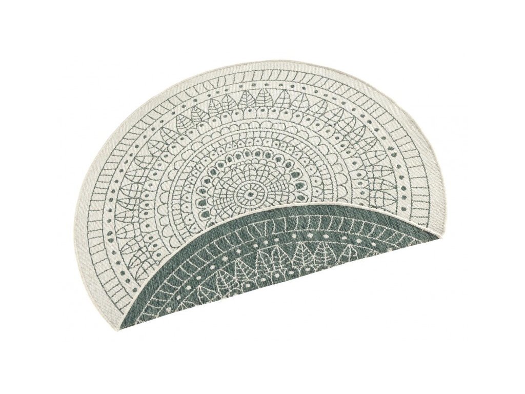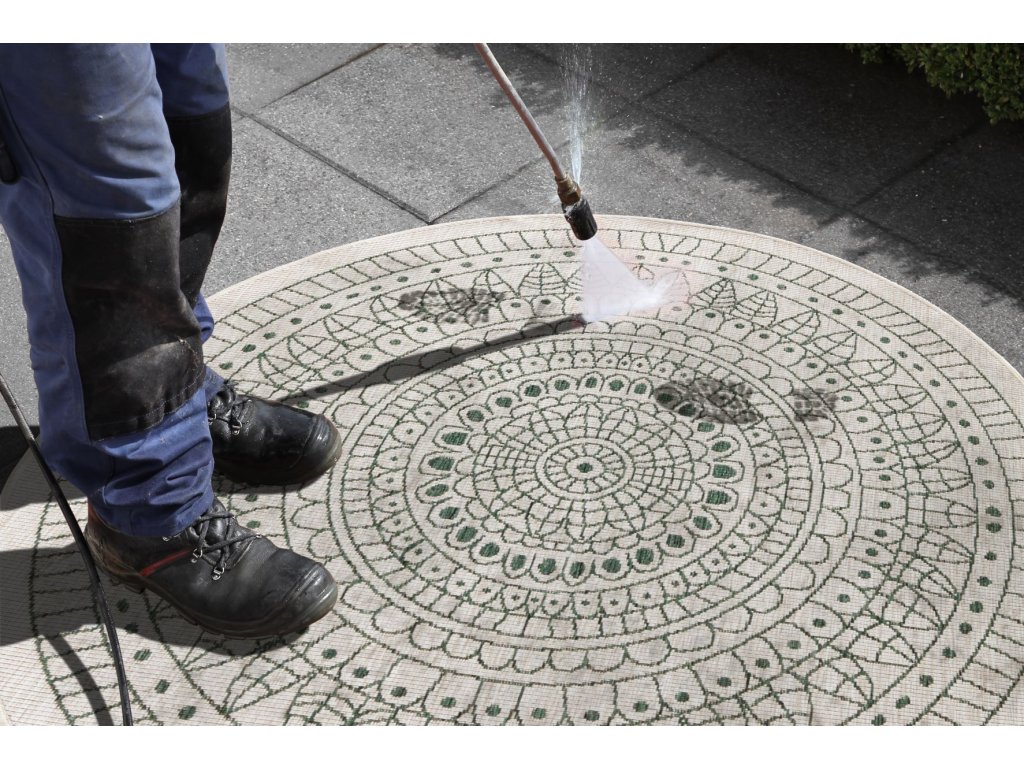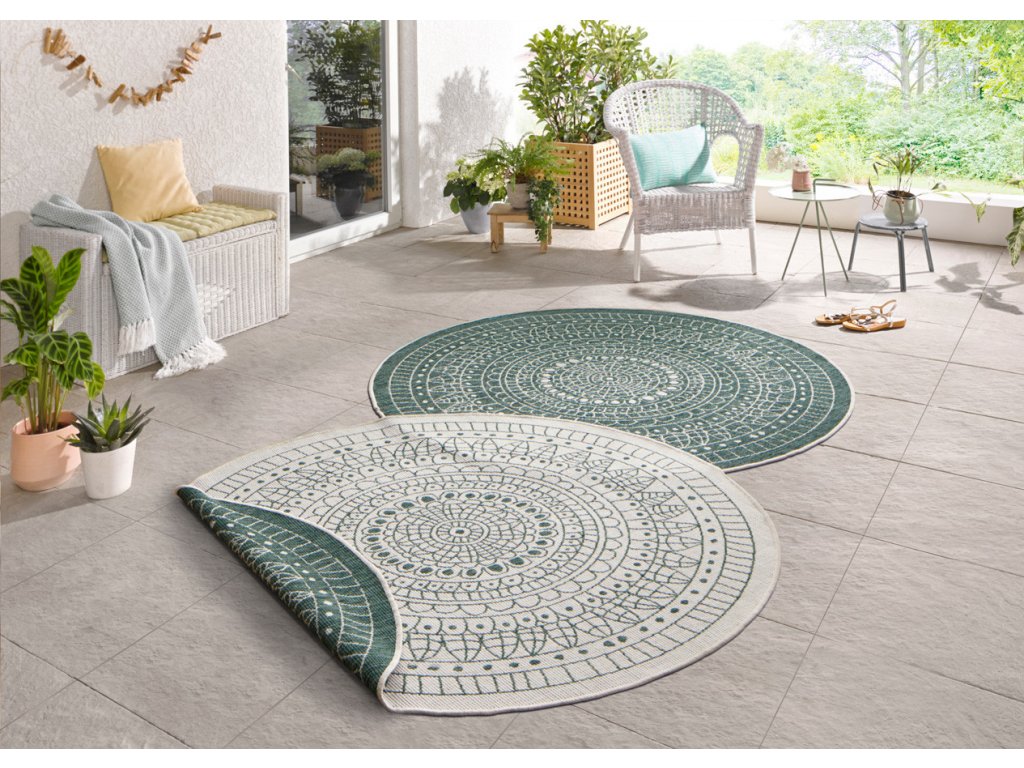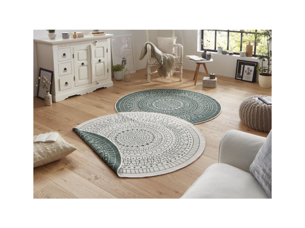 Kulatý kusový koberec Twin-Wendeteppiche z kolekce německé značky Hanse Home. Koberec je v zeleno-béžové barvě a je oboustranný. Můžete jej použít jak do interiéru, tak jako venkovní koberec například na terasu.