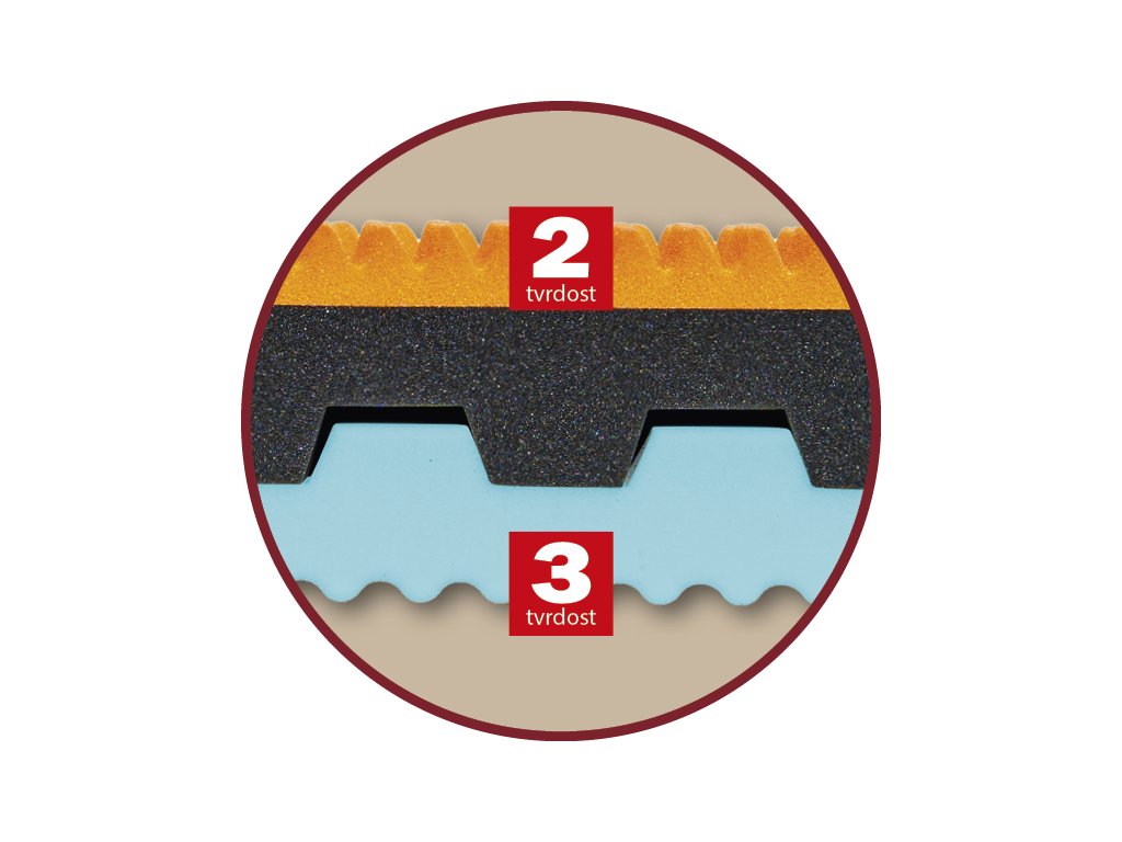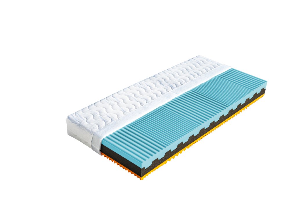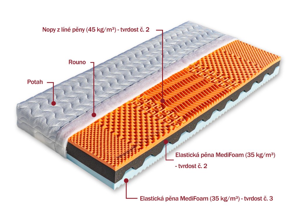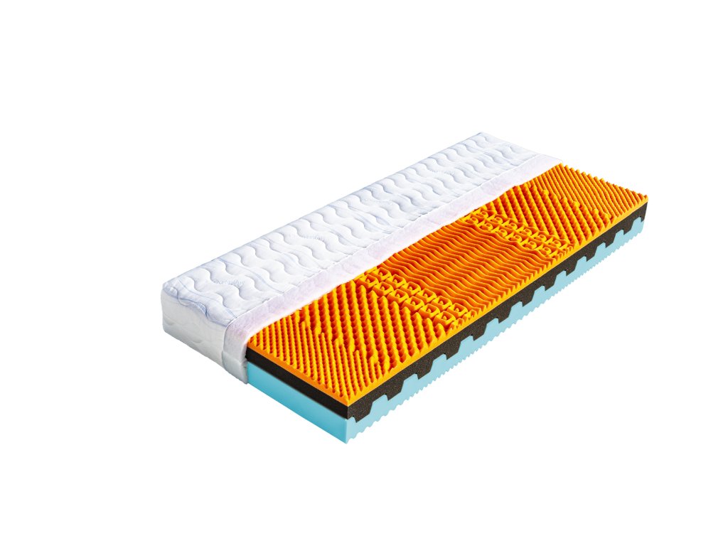 Kvalitní matrace, jejíž oranžovou nosnou vrstvu tvoří oblíbená líná bio pěna tvarovaná do masážních nopů.