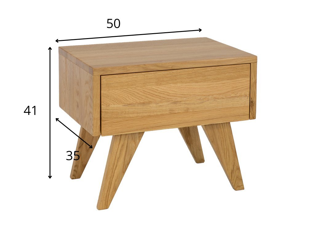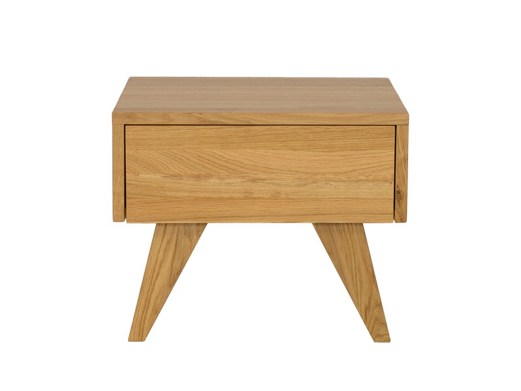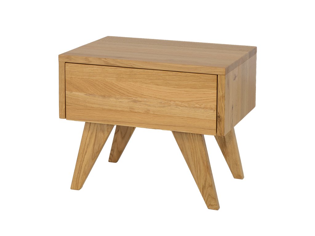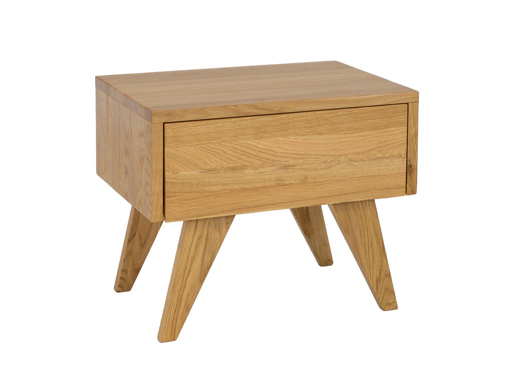 Dubový noční stolek se zásuvkou a šikmými nohami.