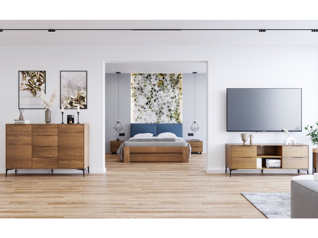 Noční stolek lze perfektně sladit s vitrínou, komodou nebo šatní skříní z této kolekce. Společně vytvářejí harmonický celek s důrazem na přírodní materiály a moderní vzhled.