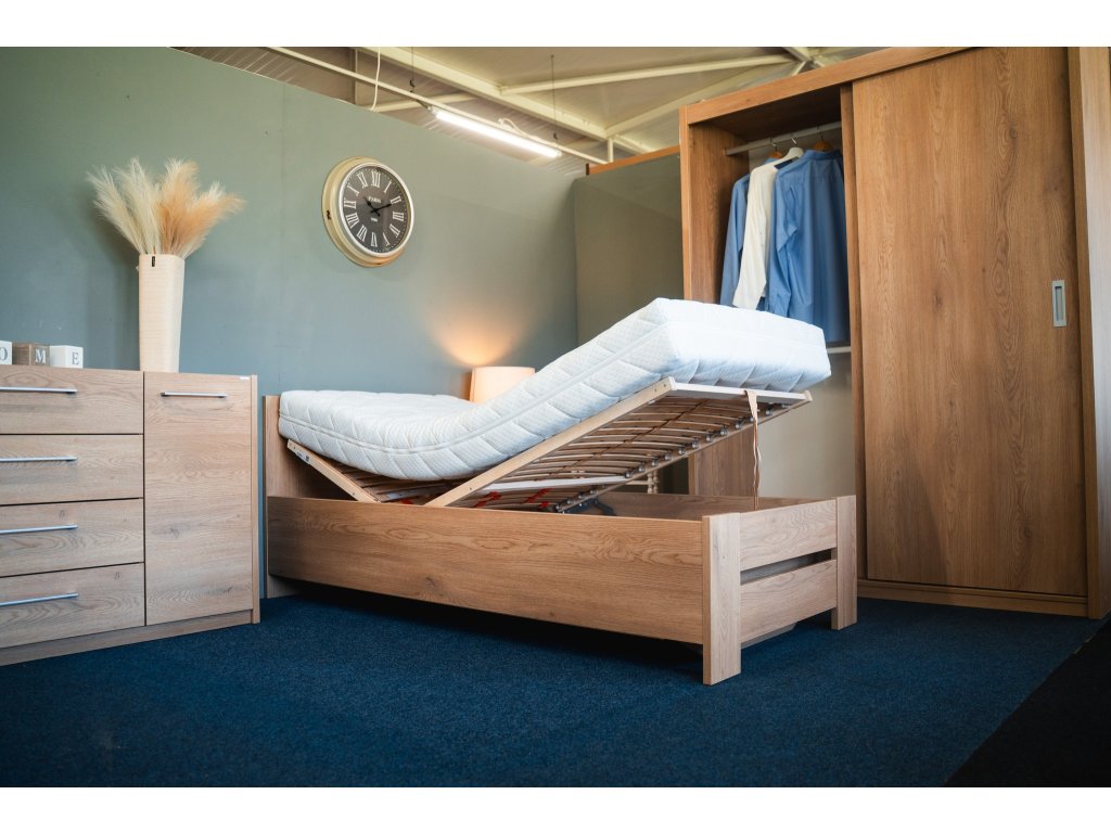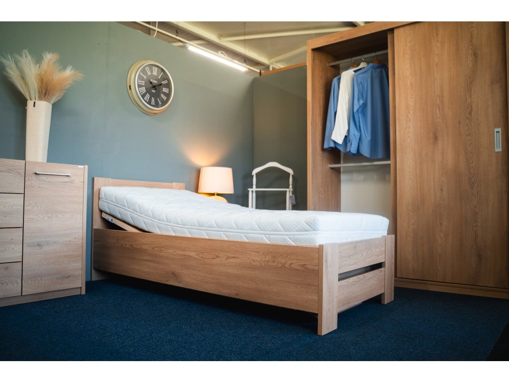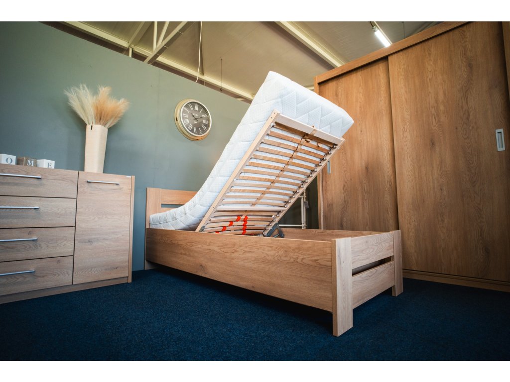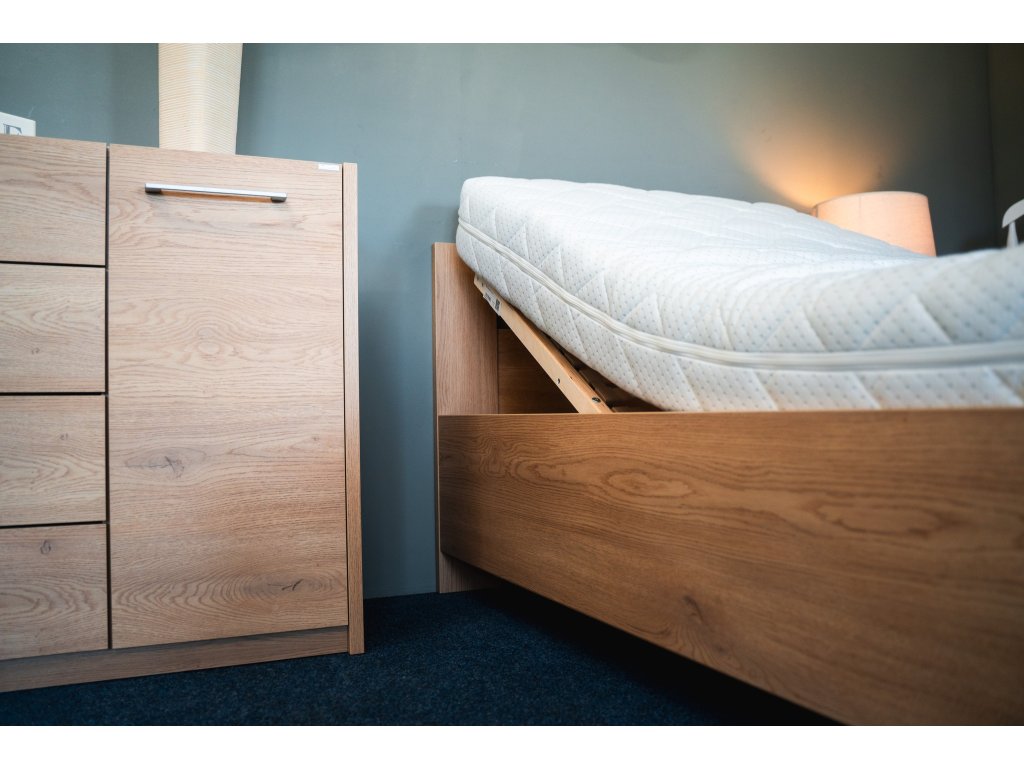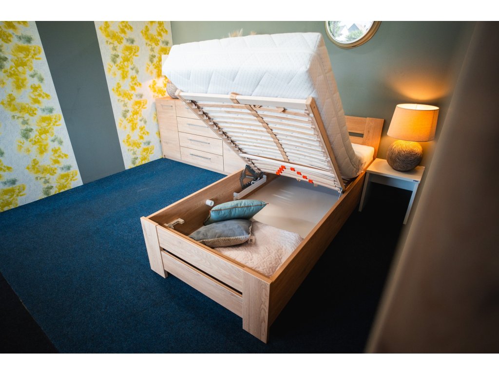 Zvýšené lůžko BÁRA s úložným prostorem. Součástí je polohovatelný 28-lamelový rošt (polohování hlava a nohy). Rošt je vyklopný od nohou a umožňuje přístup k úložnému prostoru pod roštem.