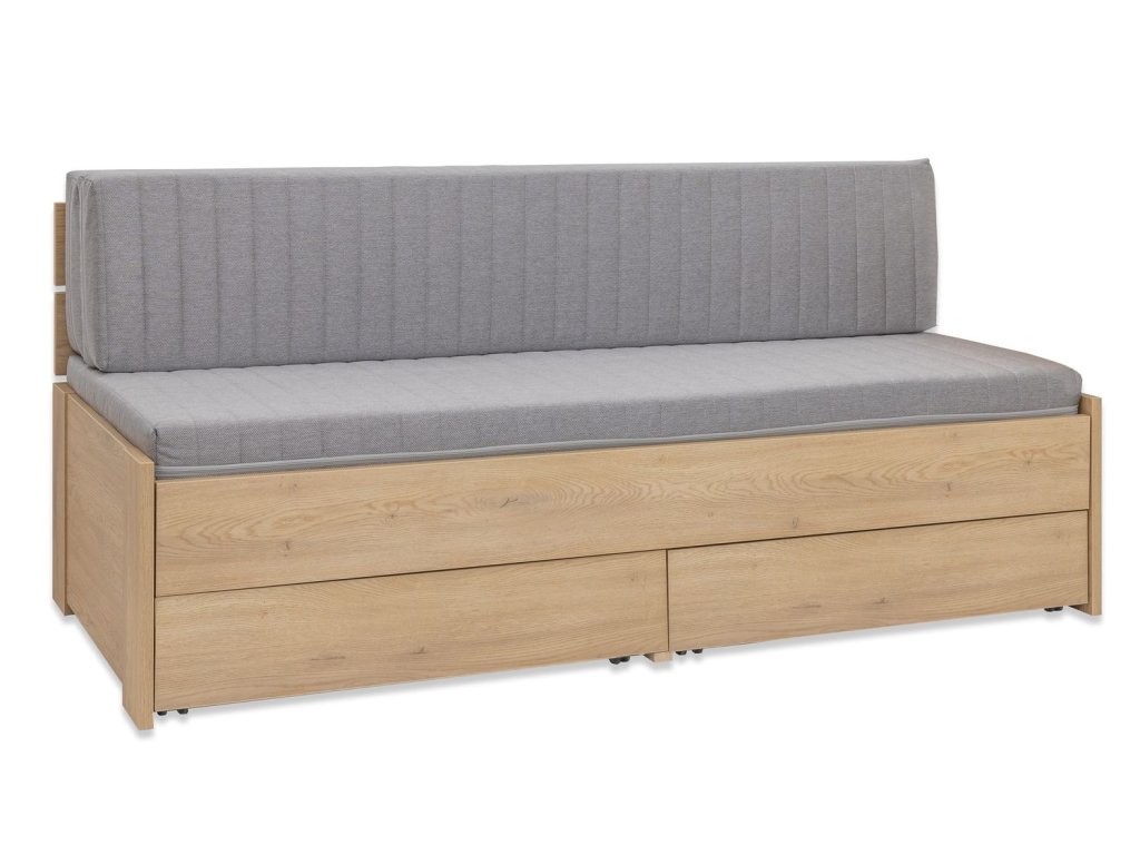Pohovka se rozkládá vysunutím sedací části a nabízí prostornou lehací plochu 170 × 200 cm. Oproti výklopné variantě je zde úložný prostor řešen formou dvou zásuvek na kolečkách, které lze snadno vysunout bez rozkládání sedačky – ideální pro uložení ložního prádla, dek nebo oblečení.