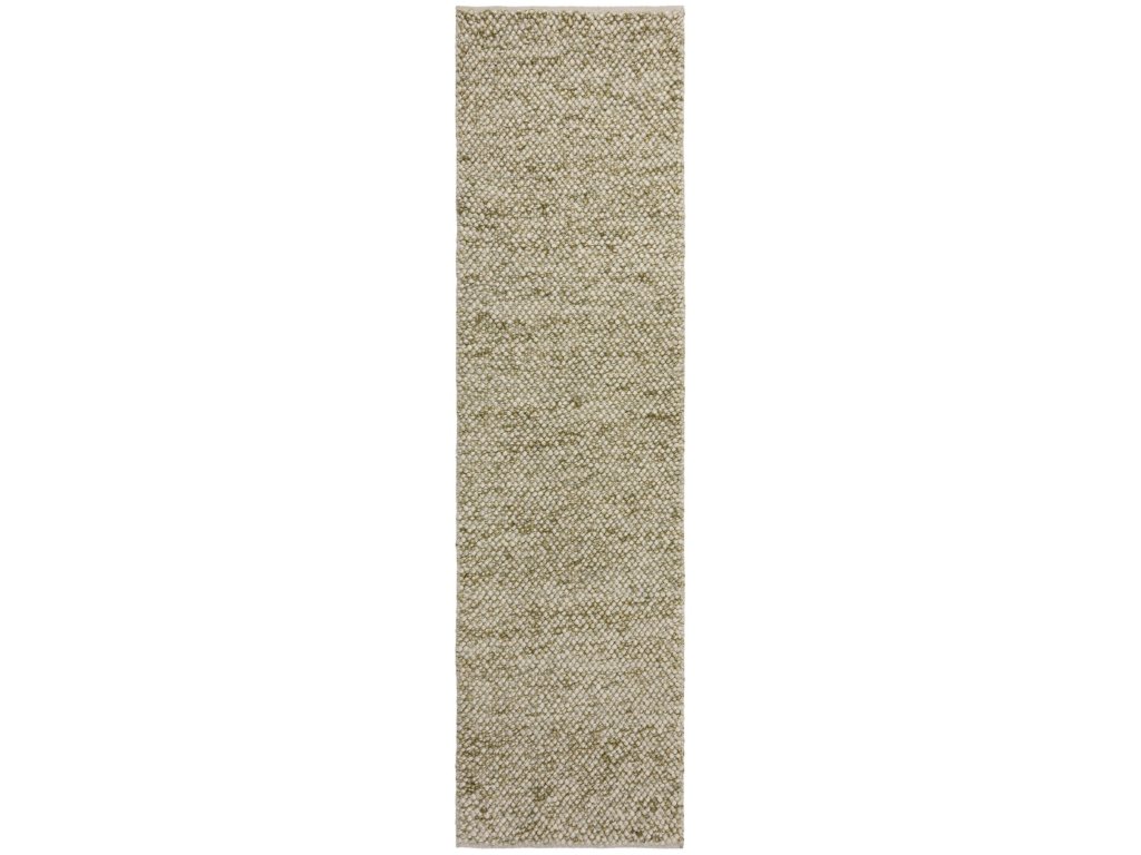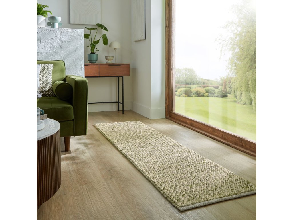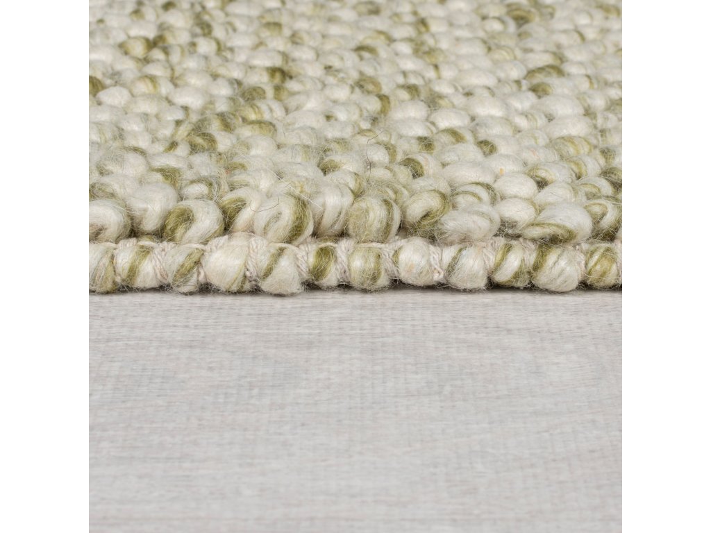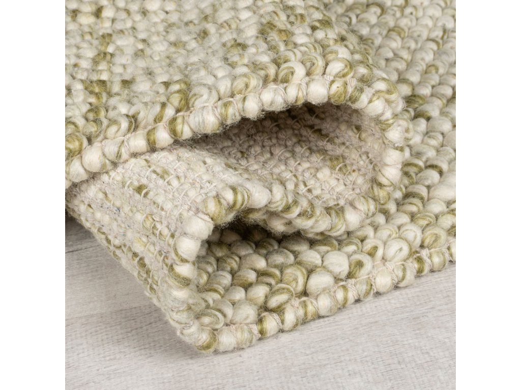 Běhoun kombinující krémově bílá a zelená vlákna zaujme svým jemně strukturovaným povrchem, který připomíná drobné, měkké kamínky. Díky směsi vlny a polyesteru poskytuje vynikající izolační vlastnosti, udržuje teplo a tlumí hluk. Jeho hřejivý a měkký povrch je příjemný na došlap, což oceníte zejména v ložnici, obývacím pokoji nebo chodbě. Snadná údržba zajišťuje, že koberec zůstane dlouho jako nový.
