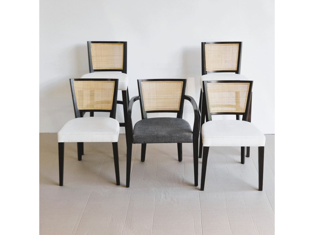 Retro jídelní sestava složená z křesla K482, dvou židlí 482 a dvou barovek B482 s čalouněnými sedáky. Židle a barovky v bílé kožence a křeslo v šedé žinylkové látce. Černa kostra a opěrka zad s přírodním výpletem. Tato nadčasová kombinace vynikne v klasických i moderních interiérech a působí lehce, vzdušně a zároveň stabilně.