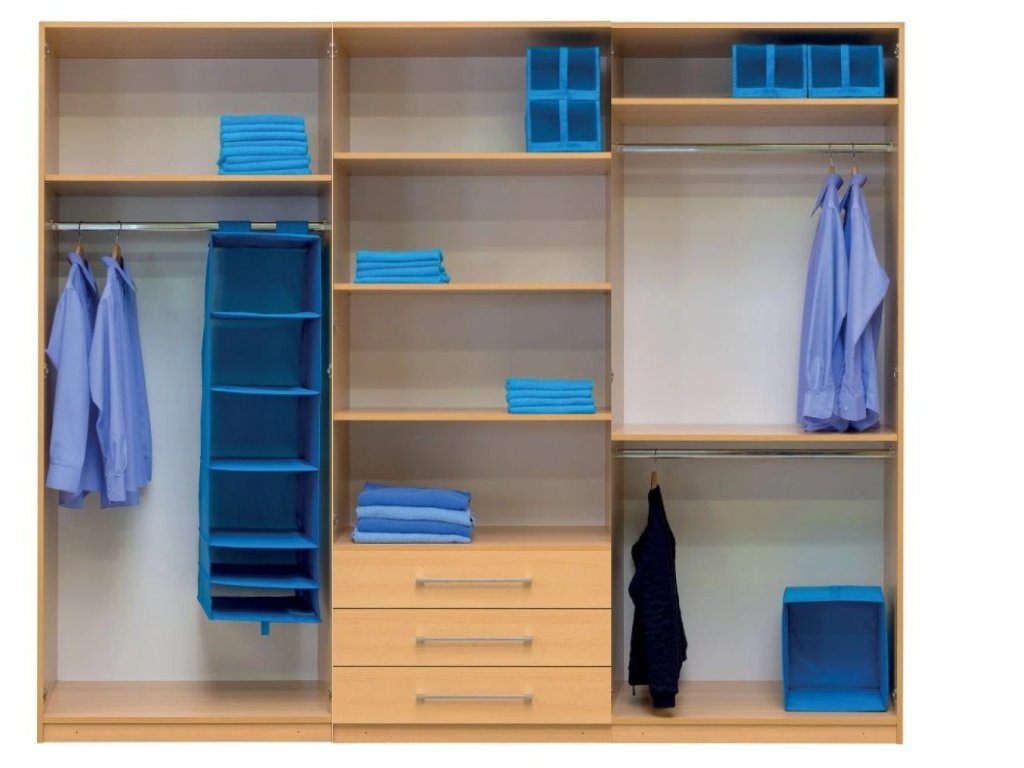 - 6-dveřová šatní skříň s policemi, šatními tyčemi a zásuvkami,