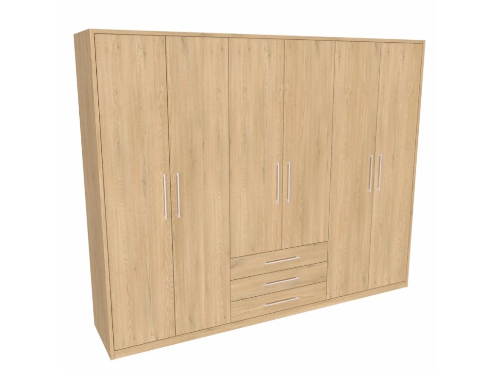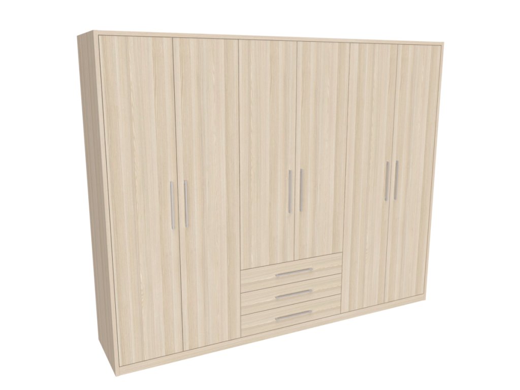 6-dveřová skříň s policemi, šatními tyčemi a zásuvkami.