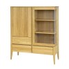 Prosklená část umožní krásně vystavit dekorace, knihy nebo nádobí, zatímco uzavřená skříňka a tři zásuvky skryjí vše, co nemá být na očích. Díky vysokým zešikmeným nohám působí vitrína vzdušněji a zároveň usnadňuje úklid pod nábytkem.