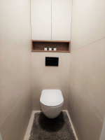 Stejné materiály jako v kuchyni si majitelka přála využít pro nábytek, niky a skříňku v koupelně a na toaletě pro sjednocení vzhledu celého interiéru.