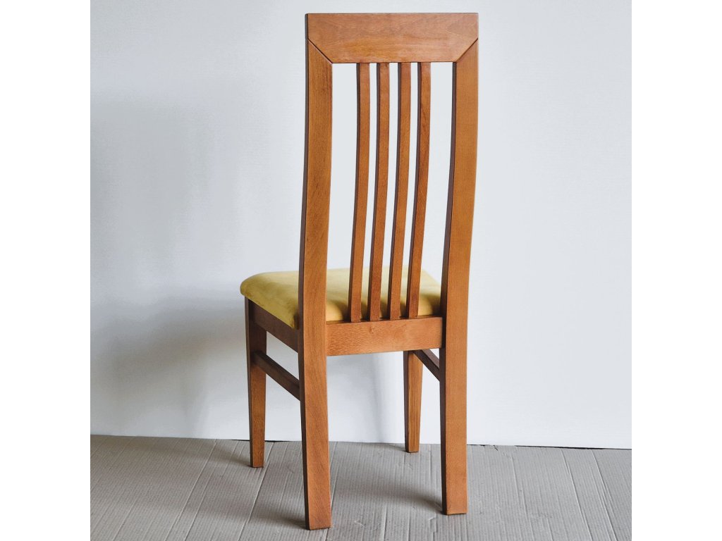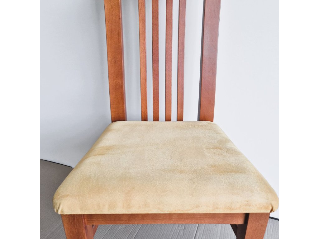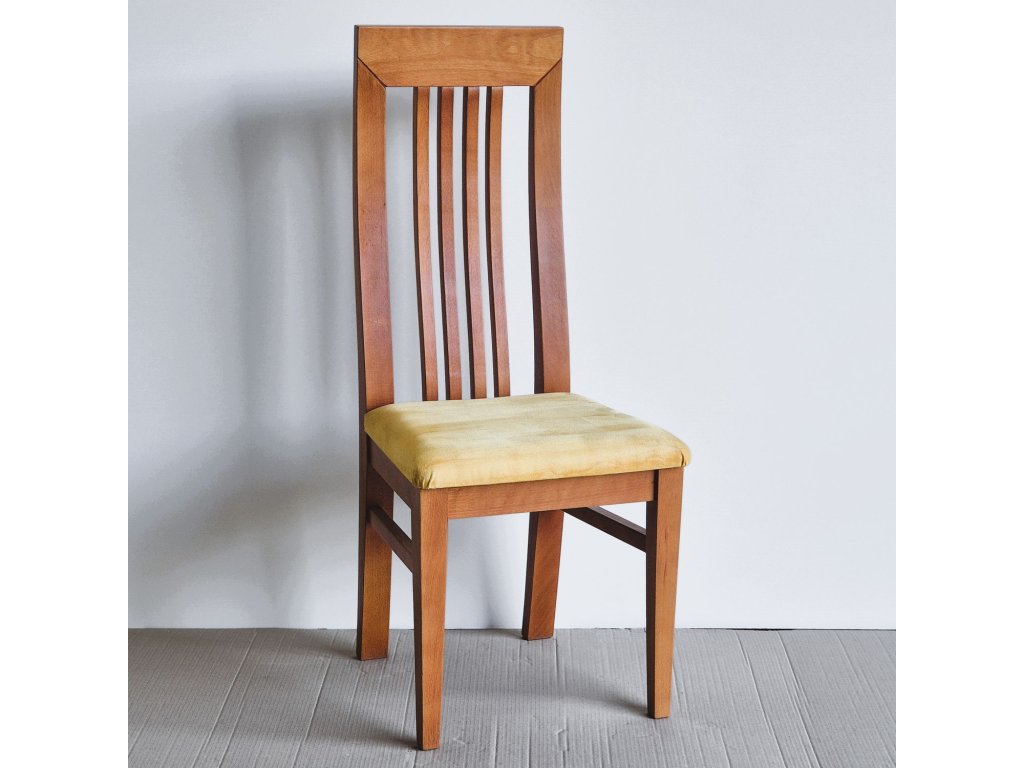 Jídelní židle s vysokou tvarovanou opěrkou, která zajišťuje pohodlné sezení i při delším stolování. Konstrukce z masivního dřeva je mořena do teplého odstínu a doplněna čalouněným sedákem ve světlé látce. Tradiční design židle se hodí do klasických i venkovských interiérů.