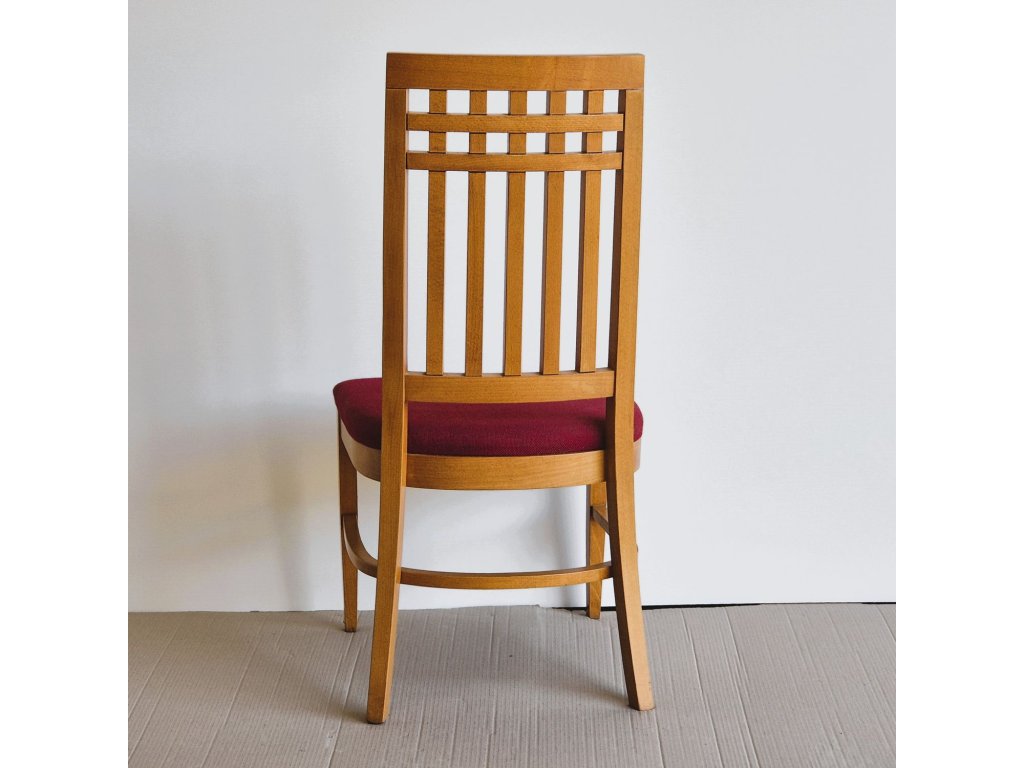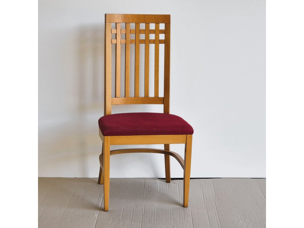 Jídelní židle s výrazným mřížkovaným opěradlem, které dodává nábytku osobitý retro vzhled. Masivní konstrukce v teplém moření je doplněna čalouněným sedákem v tmavě červené látce. Díky pevnému zpracování a vysokému opěradlu je sezení pohodlné i při delším stolování.