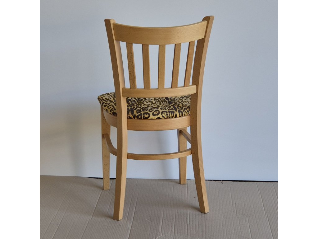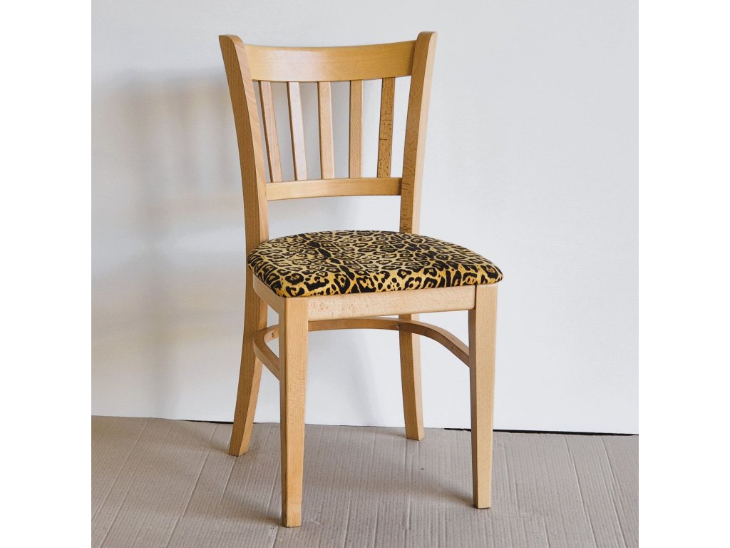Jídelní židle s čalouněným sedákem v extravagantní zvířecí látce, která upoutá na první pohled. Dřevěná konstrukce z masivu v přírodním moření a tvarovaná opěrka zajišťují pevnost, stabilitu i pohodlí při sezení. Ideální doplněk do interiérů s odvahou a osobitým stylem.