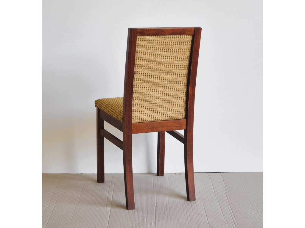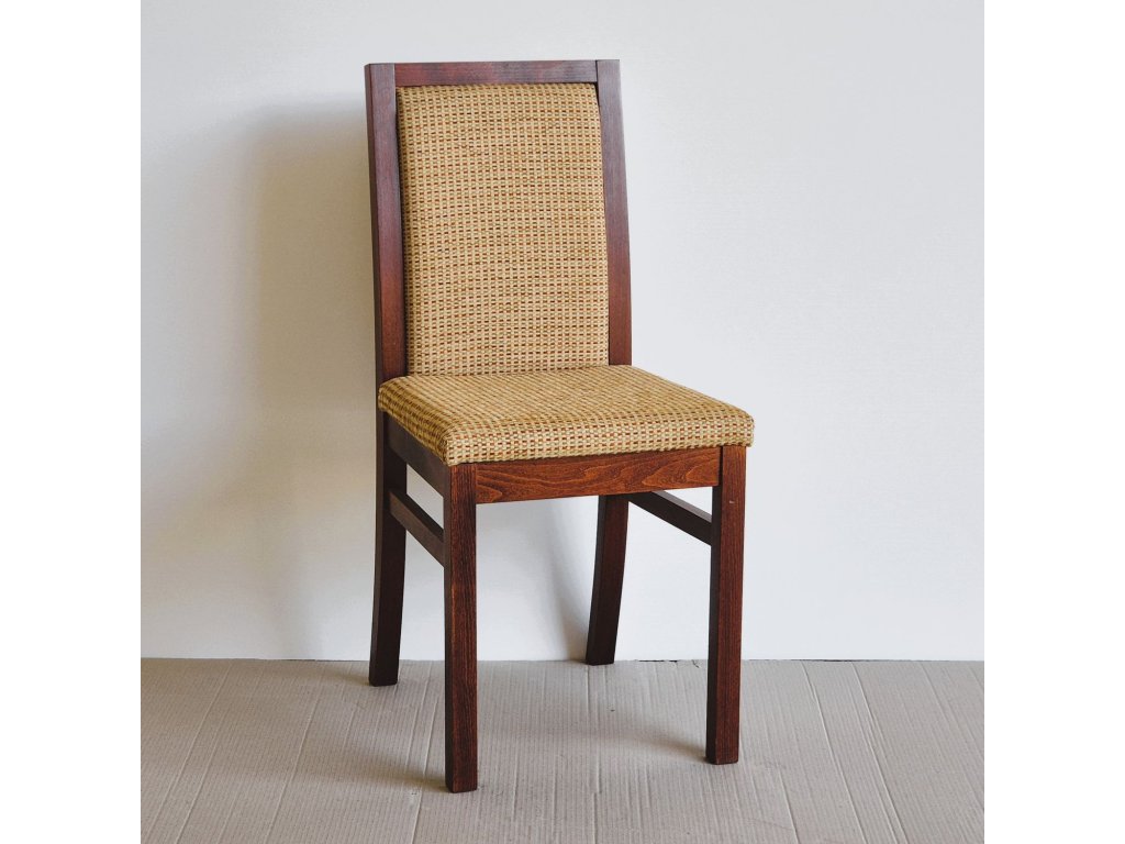 Jídelní židle s vysokou opěrkou a čalouněním v odstínu s decentním vzorem. Konstrukce je z masivního dřeva v tmavě mořeném provedení. Vzhledem ke klasickému tvaru a neutrálnímu barevnému ladění se hodí jak do tradičních interiérů, tak i do modernějších jídelen.