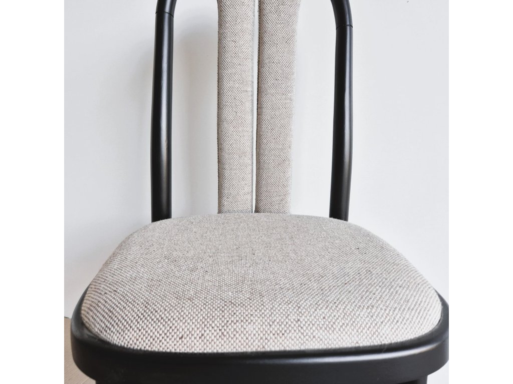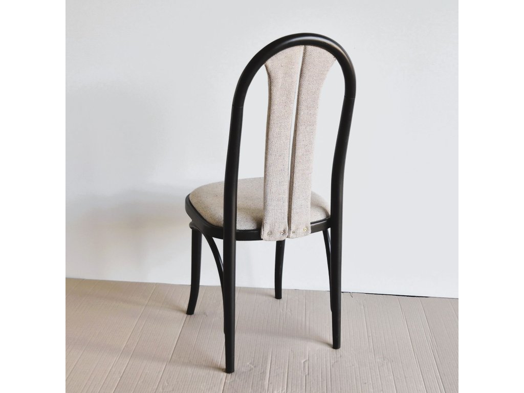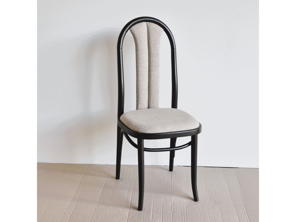 Jídelní židle s výrazným retro obloukem a čalouněným sedákem i opěrákem. Konstrukce z ohýbaného dřeva je v černém provedení, které kontrastuje se světlou strukturou látky. Klasický a nadčasový design vhodný do stylových interiérů i retro kuchyní.
